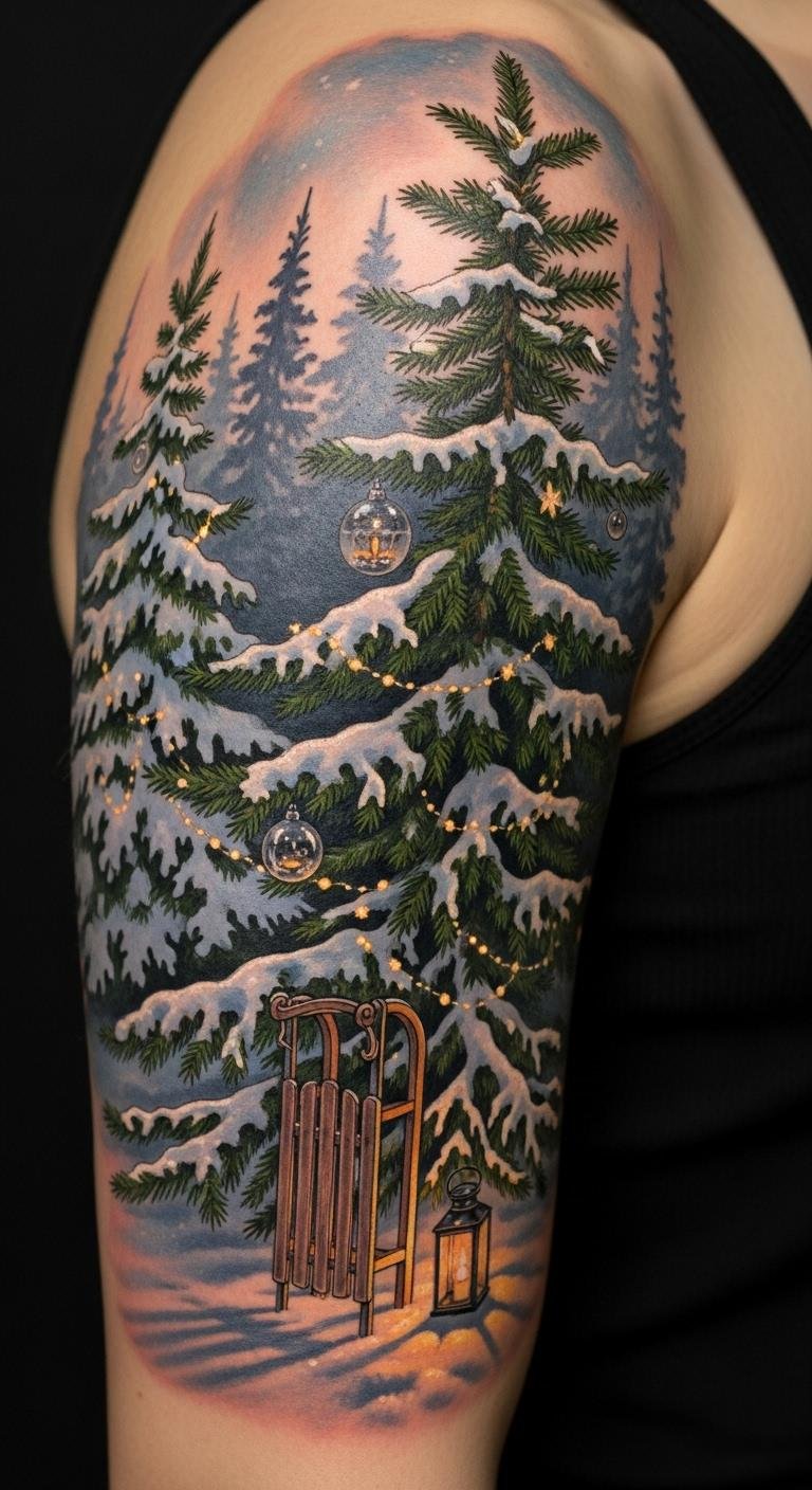 Watercolor tattoos capture the whimsy of the holiday season, but if you’re drawn to a more lifelike representation, realistic Christmas tree scenes offer an exceptional alternative.