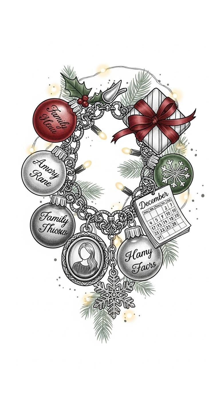 A tattoo concept translating the original festive passage into wearable art: each miniature ornament represents a memory or connection—engraved names for family, the photo locket for cherished moments, the calendar page signifying the holiday’s freedom and joy—linked by filigree and evergreen to create a tapestry of love.