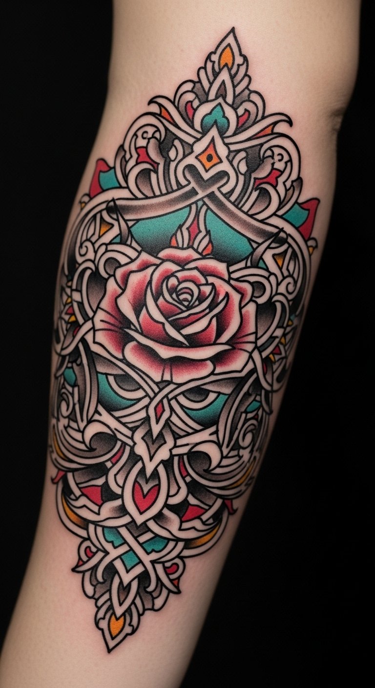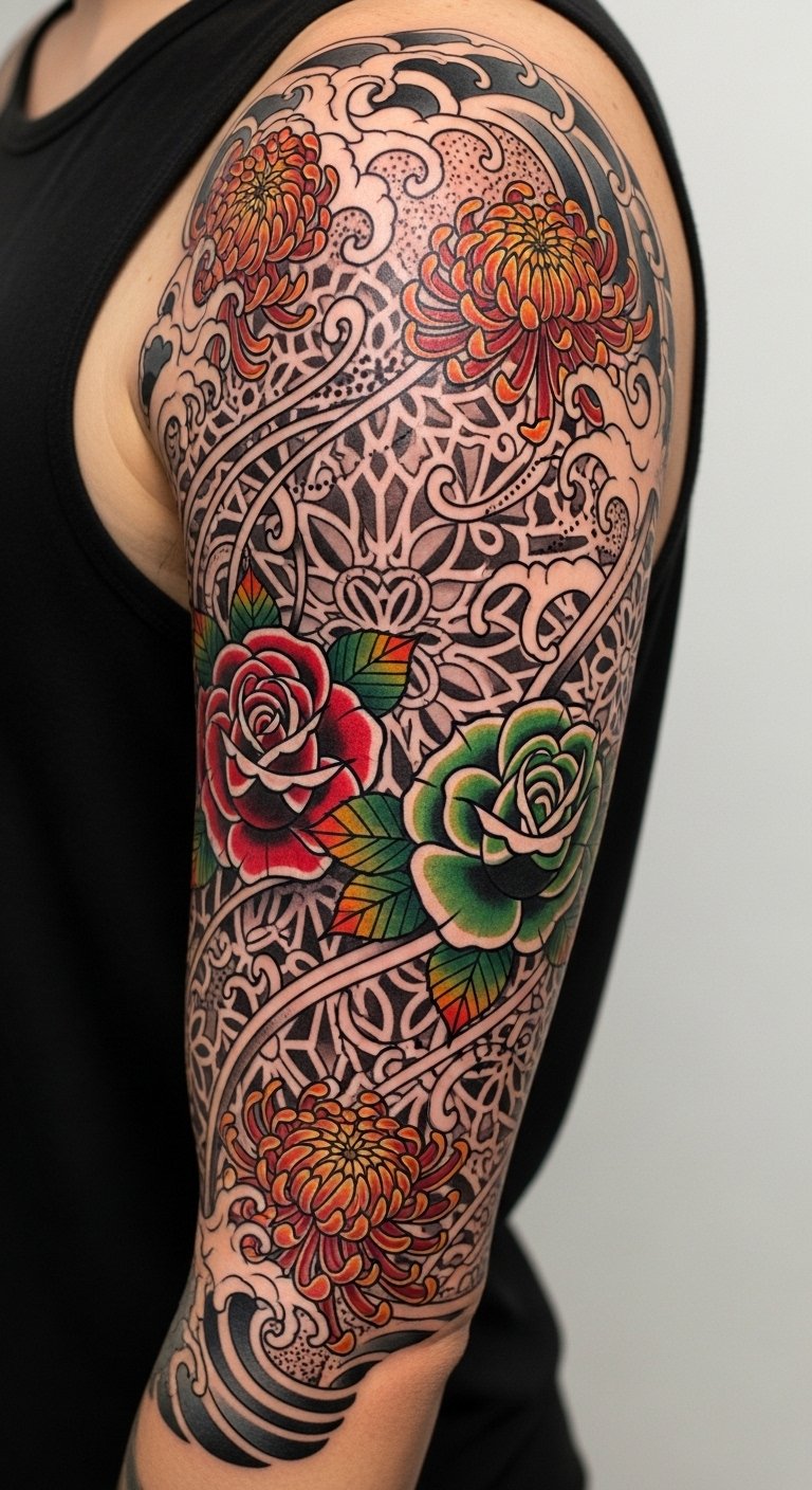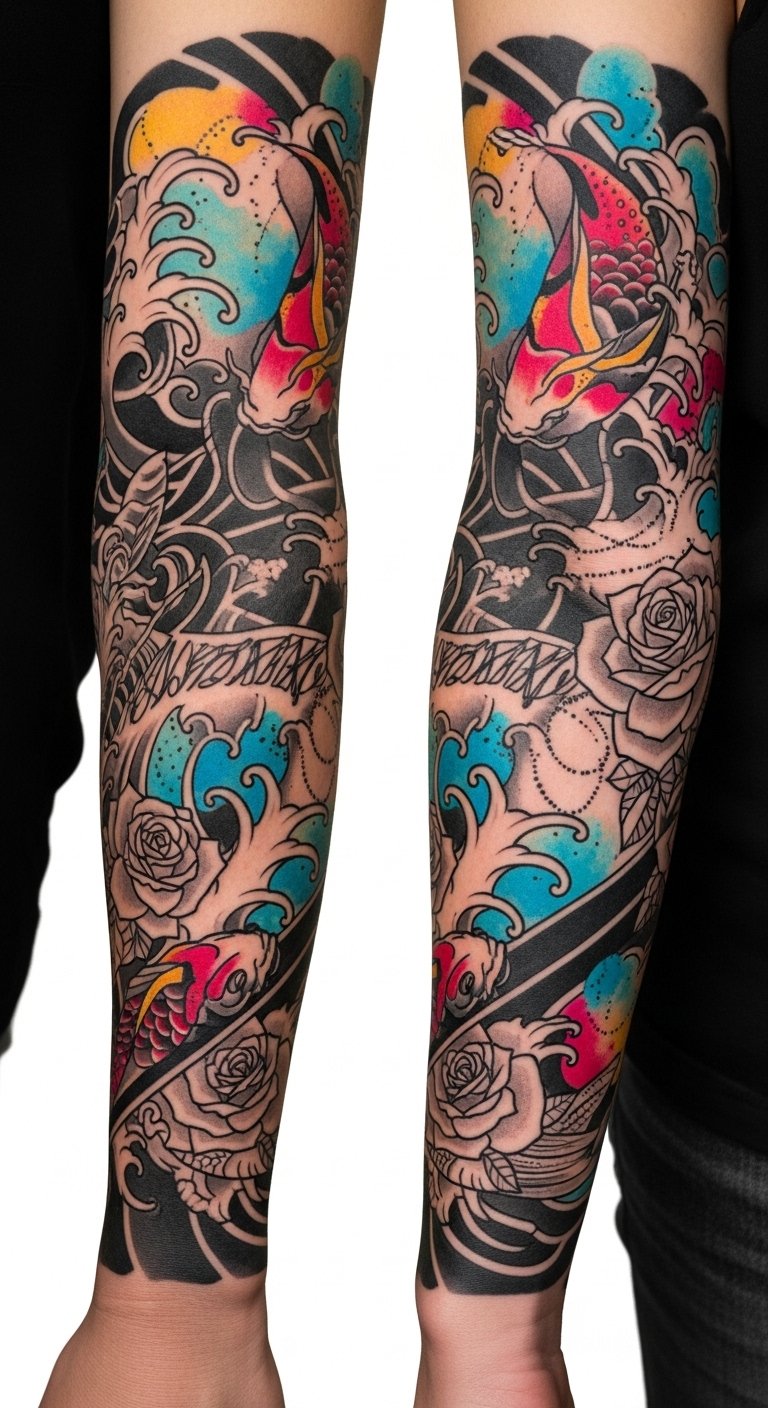 Imagine blending traditional Japanese koi with abstract shapes, or merging bold Americana anchors with delicate floral patterns. These enchanting motif combinations reflect diverse artistic influences, celebrating your individuality while transforming your skin into a canvas that tells your unique story.