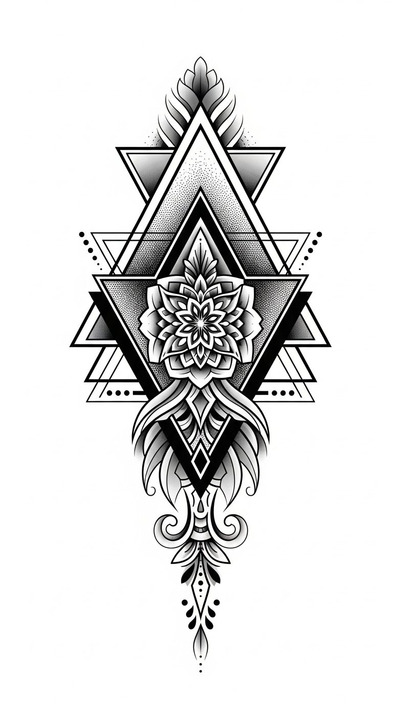 Embrace geometric harmony as you engage in pattern exploration, where sharp lines and intricate shapes dance together, creating a mesmerizing tapestry that reflects your unique essence and desire for artistic freedom. This design symbolizes the union of order and fluidity — the triangles and hexagons represent structure, balance, and personal boundaries, while the filigree and mandala elements evoke growth, inner harmony, and continual transformation.