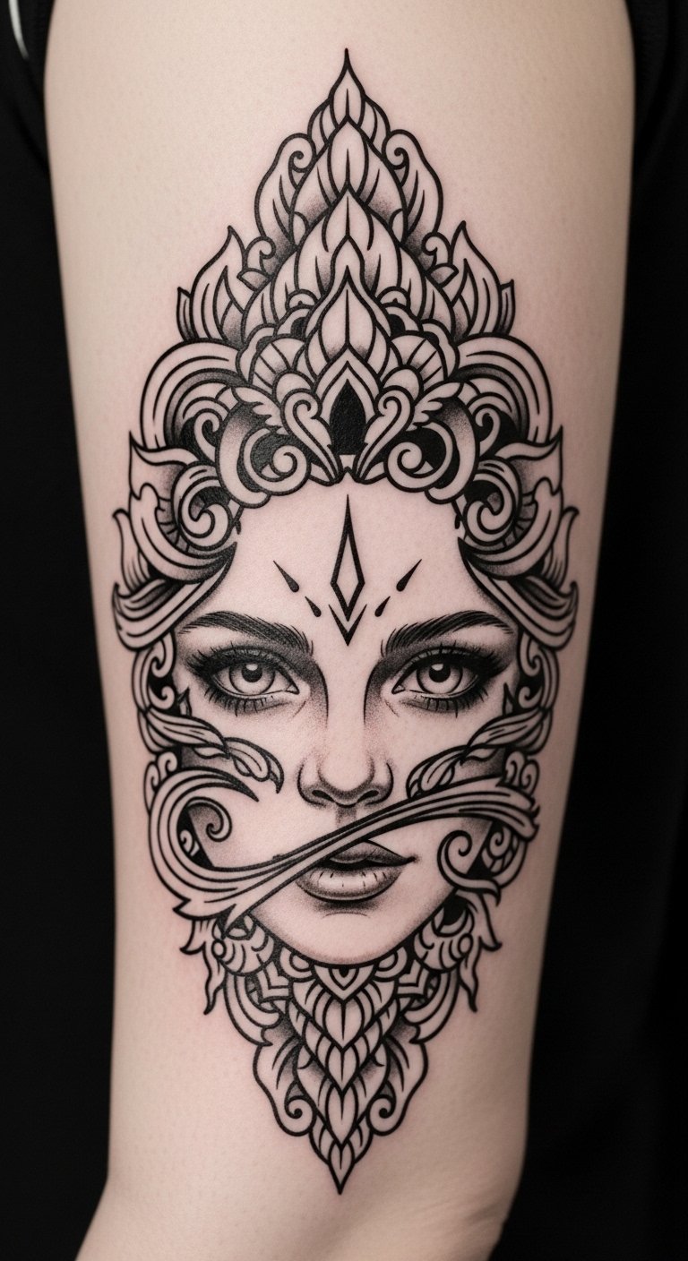 Bold outlines anchor your tattoo design, creating a striking contrast against the intricate details woven within. This artistic balance enhances the visual impact, marrying modern aesthetics with cultural storytelling. Each bold line frames delicate elements, achieving design harmony that captivates and inspires.