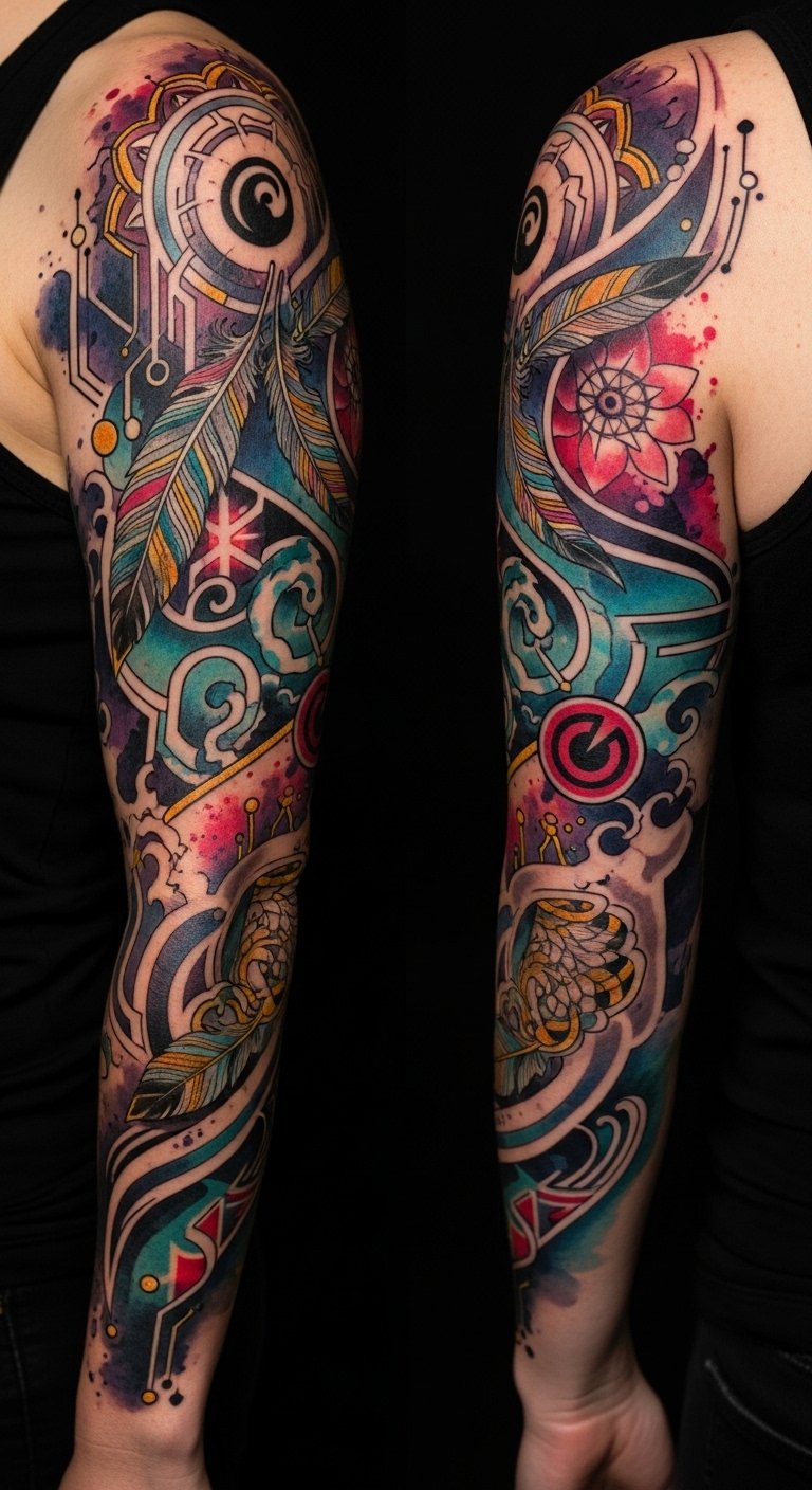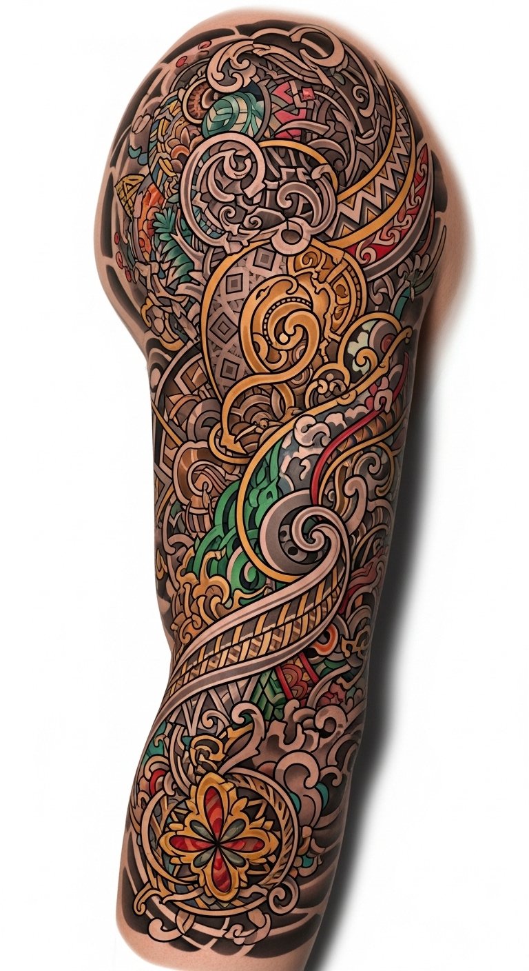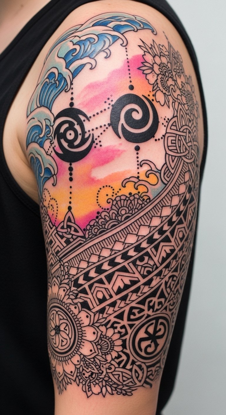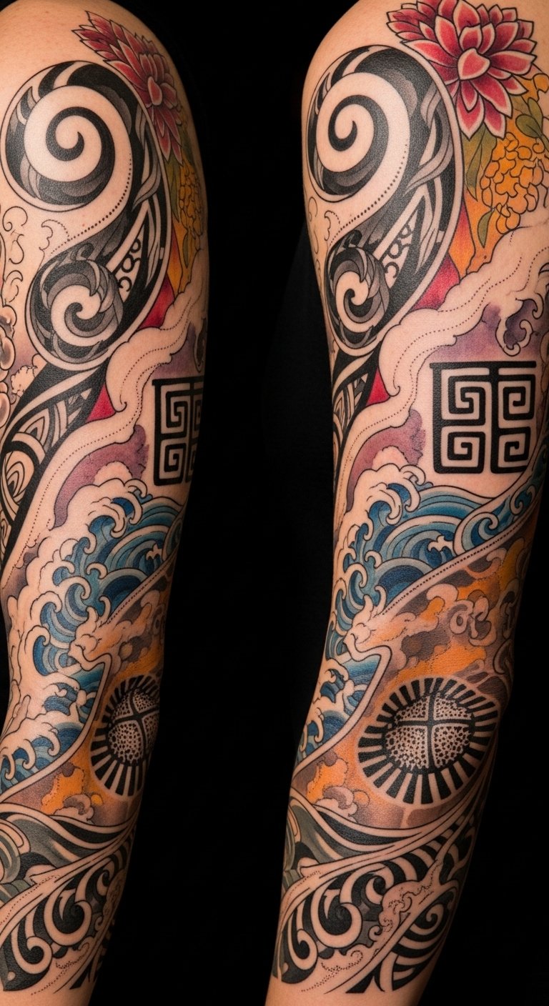 A flowing sleeve design that blends interlocking motifs from different traditions—delicate sakura petals merging into geometric Mehndi patterns, a Celtic knot that transitions into minimalist brush-stroke kanji, and modern bio-mechanical accents that hint at advanced tattoo technology—rendered with gradient color transitions and fine-line detail. Symbolically, the piece celebrates cultural dialogue, personal growth, and technological progress; emotionally it evokes belonging, curiosity, and pride. Ideal placement is a full arm sleeve or wraparound calf to allow the layered elements to breathe and for viewers to discover the cultural transitions as they move.