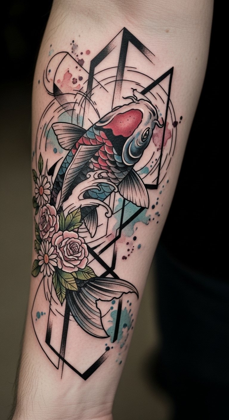 This design pairs a dynamic, ascending koi rendered in bold neo-traditional lines with softly falling cherry blossoms in watercolor washes; placement along the outer forearm or calf allows the koi’s movement to follow muscle flow, symbolizing perseverance and transformation while the blossoms represent transience and beauty.