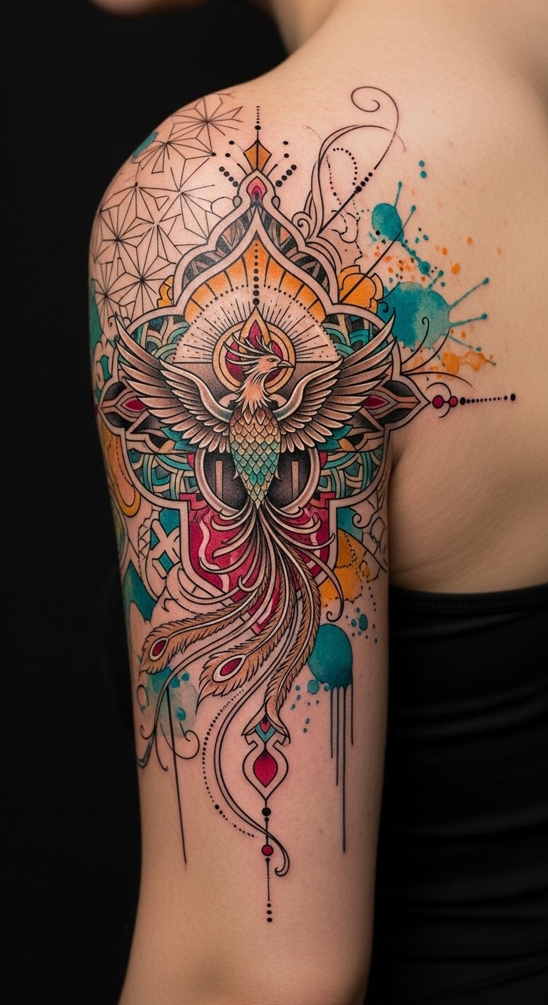 The phoenix center symbolizes rebirth and resilience, the geometric motifs represent cultural roots and continuity, while the watercolor accents evoke emotional fluidity and life’s unpredictable beauty; placed on the mid-forearm it offers visibility and personal reminder, or on the upper back it becomes a private emblem of transformation, inviting both introspection and storytelling.
