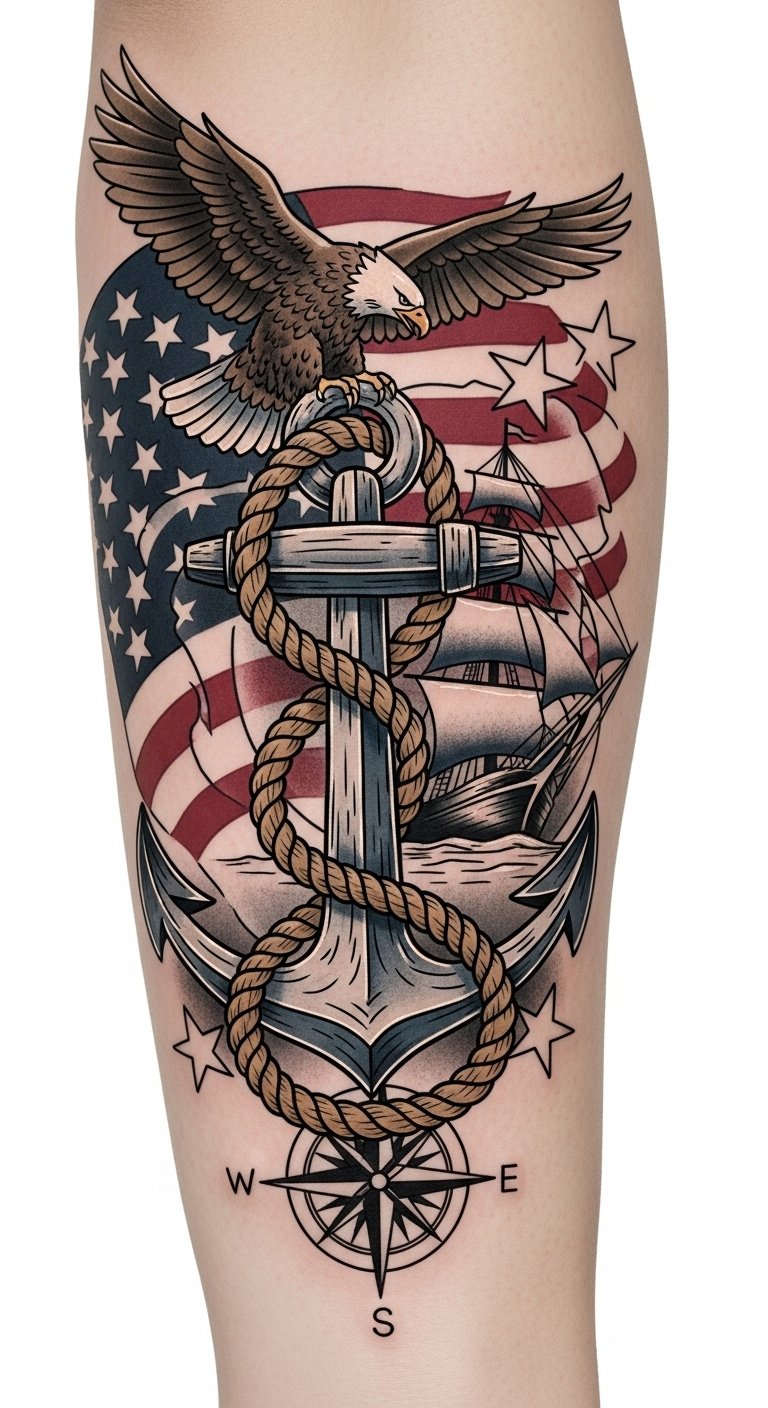What draws you to the timeless allure of nautical and Americana themes in fusion tattoos? The rich nautical symbolism of anchors and ships evokes a sense of adventure, while Americana motifs like eagles and stars celebrate freedom.