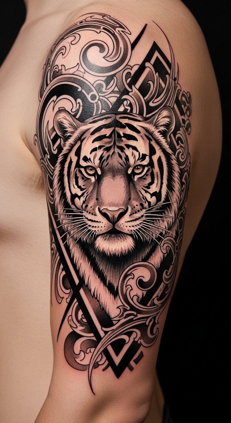 Place this composition on the upper arm or back where the curved surface allows the tiger’s gaze to interact with movement, creating an emotional focal point that feels both protective and proudly expressive.