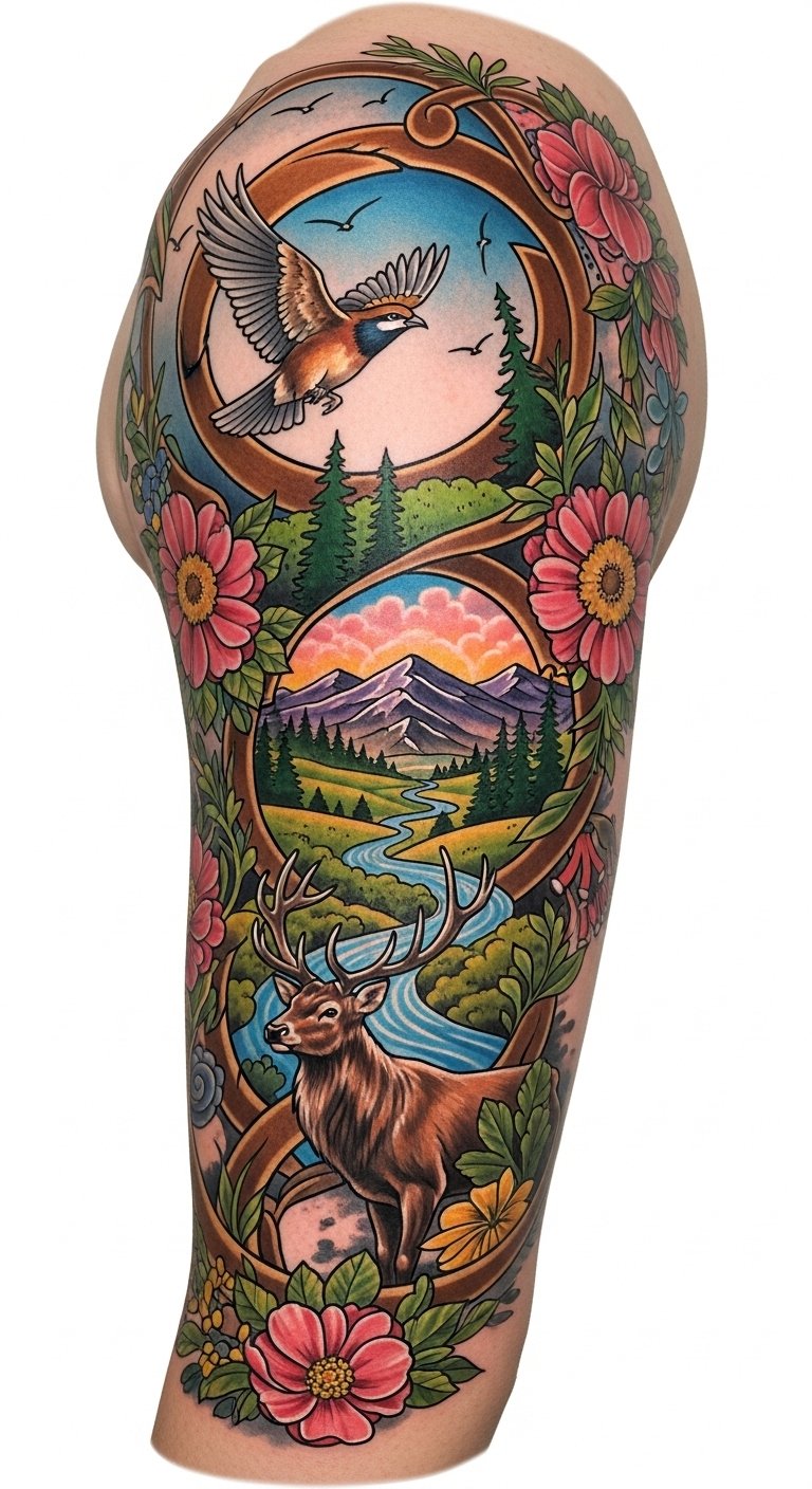 This design concept weaves together organic shapes, florals, and wildlife into a flowing composition meant for a forearm sleeve or along the ribcage; symbolism centers on growth, resilience, and harmony with nature, where intertwining vines and blossoms represent personal evolution, wildlife motifs reflect inner spirit and instincts, and subtle landscape elements ground the piece in place and memory.