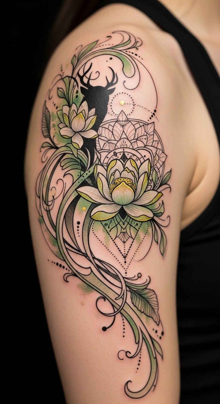 The mandala center anchors balance and unity, the lotus petals suggest spiritual growth emerging from adversity, and the owl or stag silhouette adds wisdom or strength; watercolor greens and golds evoke renewal and sanctity, while fine-line and dotwork create intimacy—ideal for shoulder blade or forearm where curvature enhances flow and invites contemplative viewing.