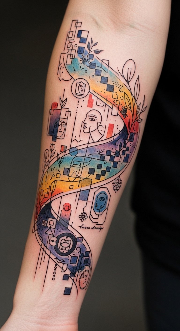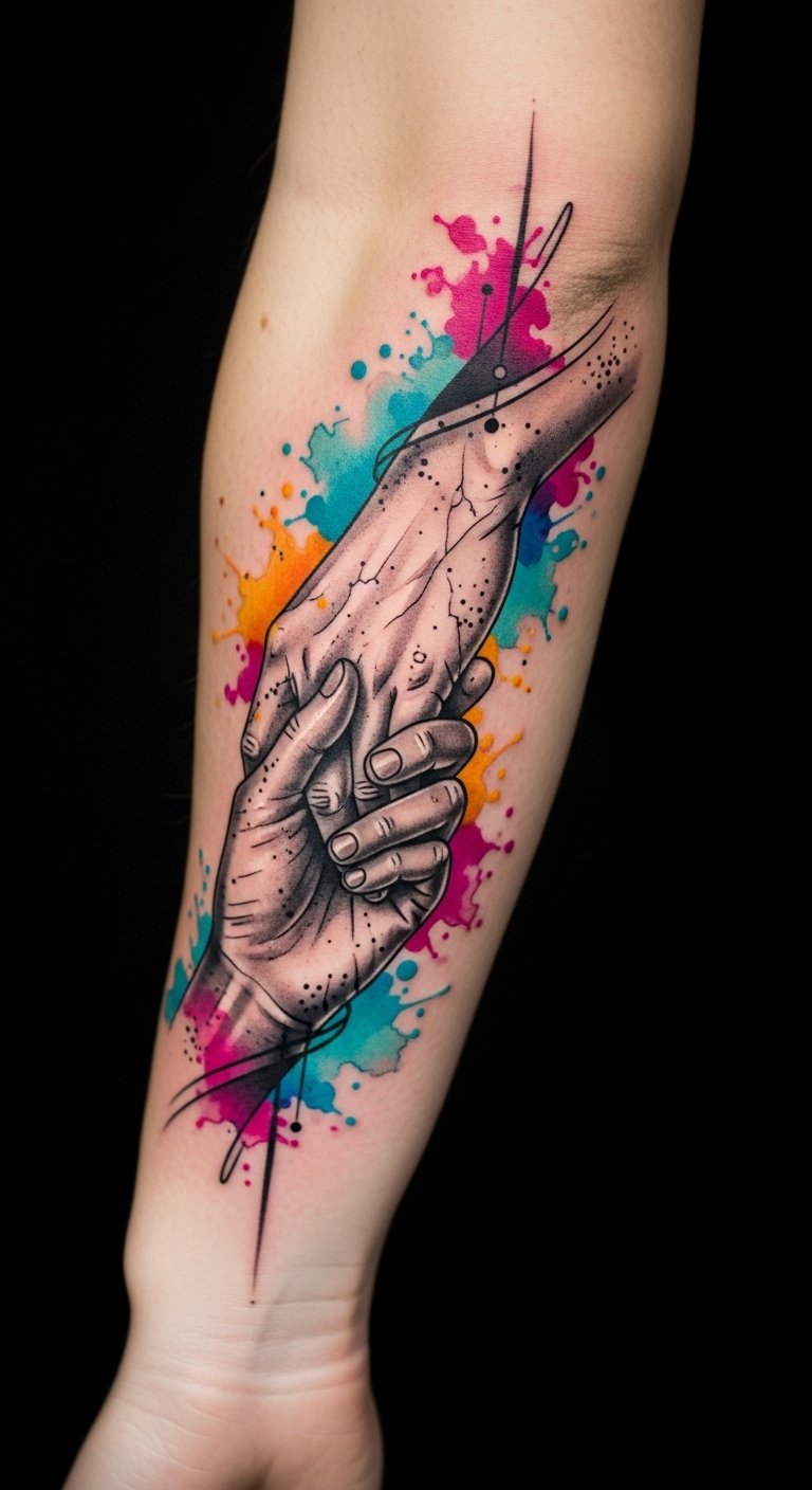 This design symbolizes unity between tradition and innovation, the realistic hand grounding personal history while the linework and watercolor express emotion and freedom; placed on the outer forearm it offers visibility for personal expression and easy expansion into sleeves, evoking intimacy, empowerment, and continual artistic growth.