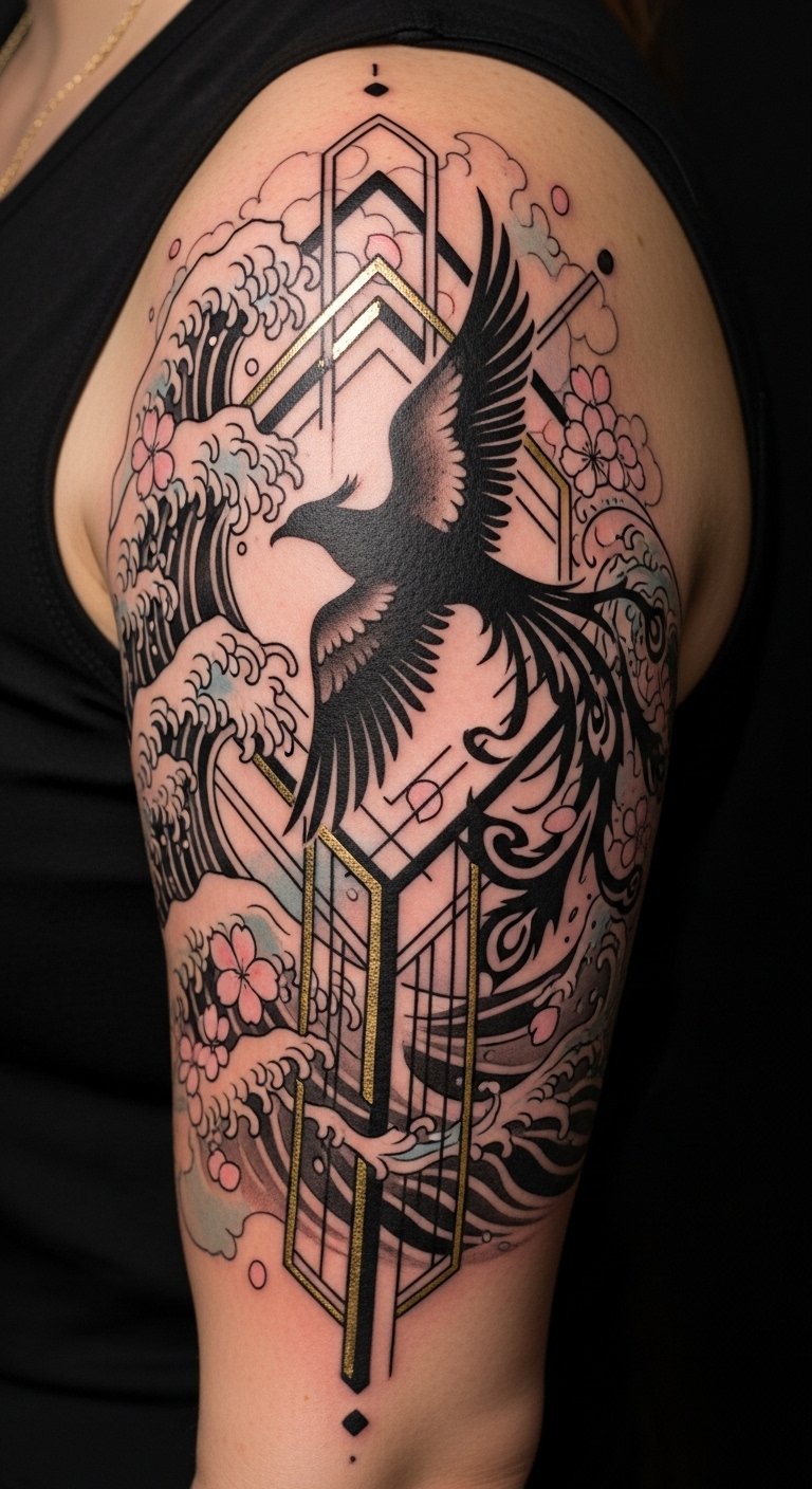 The combined imagery symbolizes resilience and renewal (phoenix), the flow of life and adaptability (waves), and beauty in transience (sakura), while Art Deco geometry brings balance and intentionality; emotionally it balances strength and grace, meant to sit on the upper arm wrapping toward the shoulder to allow movement and visibility while offering intimacy when desired.