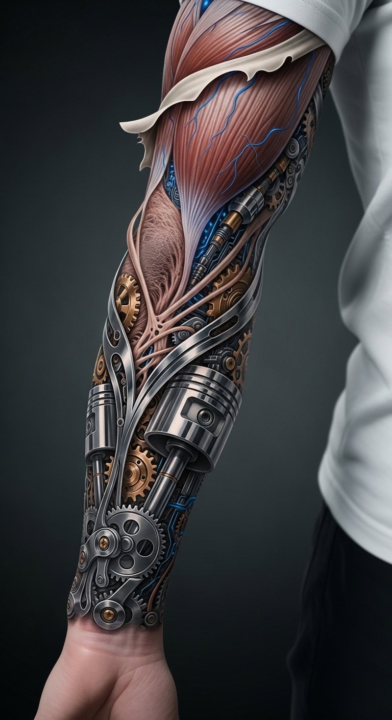 A design concept: a forearm sleeve that appears to peel back skin to reveal layered biomechanical components—polished titanium ribs, braided hydraulic tendons, and warm golden circuitry—integrated with subtle organic textures. Symbolically this juxtaposition expresses the tension and harmony between human vulnerability and engineered resilience; emotionally it evokes empowerment, curiosity, and a contemplative acceptance of change. Ideal placement follows the natural lines of the forearm, with components aligned to musculature and a small exposed “circuit heart” over the inner wrist to suggest personal core identity transformed by technology.