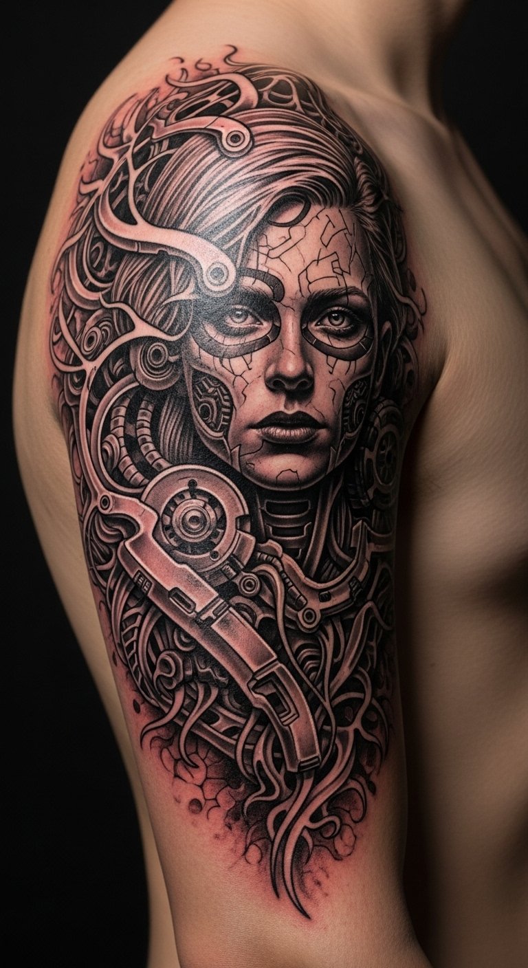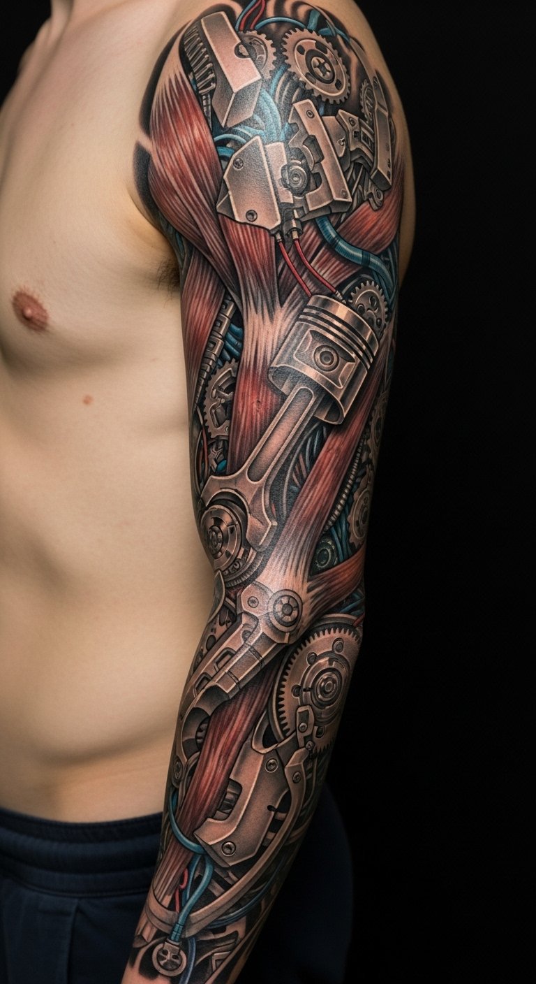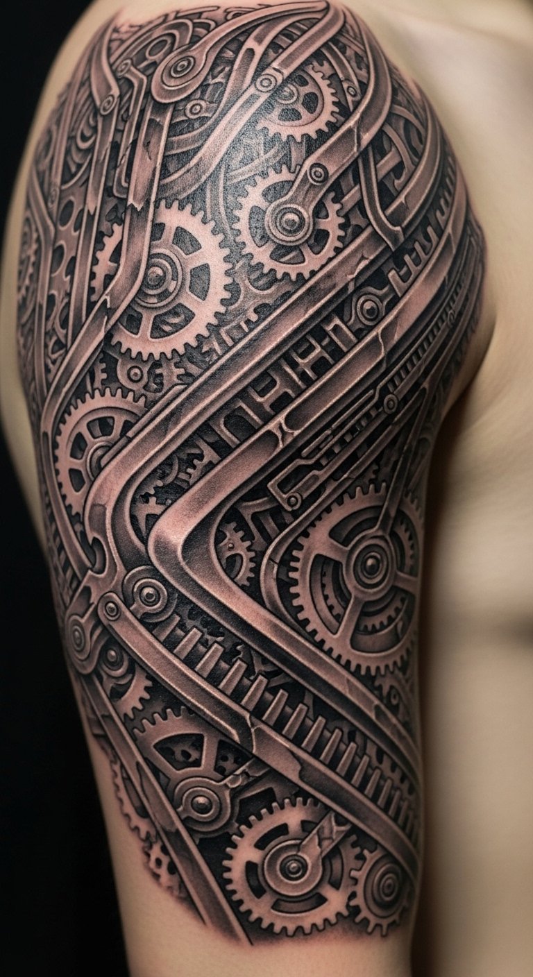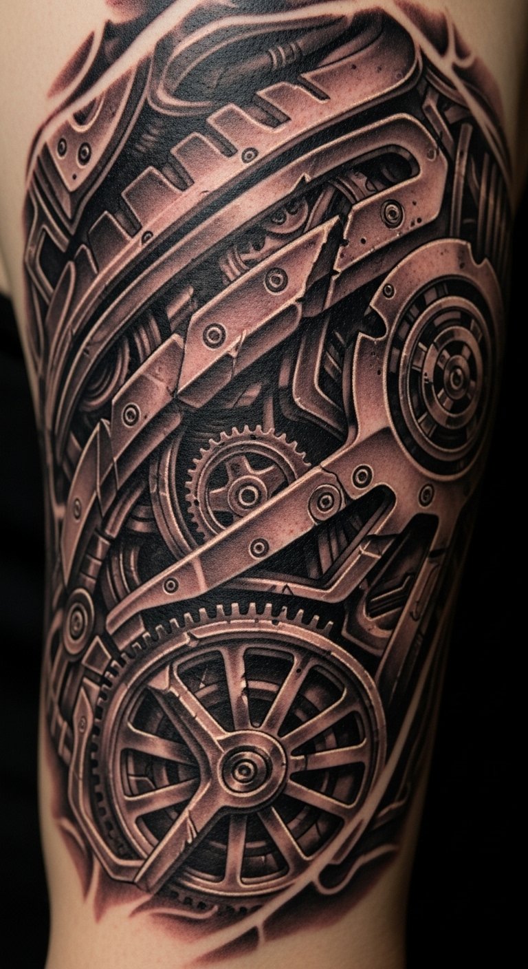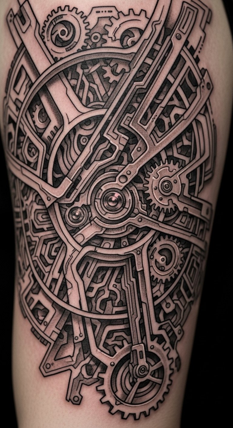 Merging organic and mechanical elements in biomechanical tattoos evokes a tension between flesh and machine: exposed sinew seamlessly transitioning into polished gears, vines entwining with pistons, and subtle circuitry flowing beneath skin-like shading.