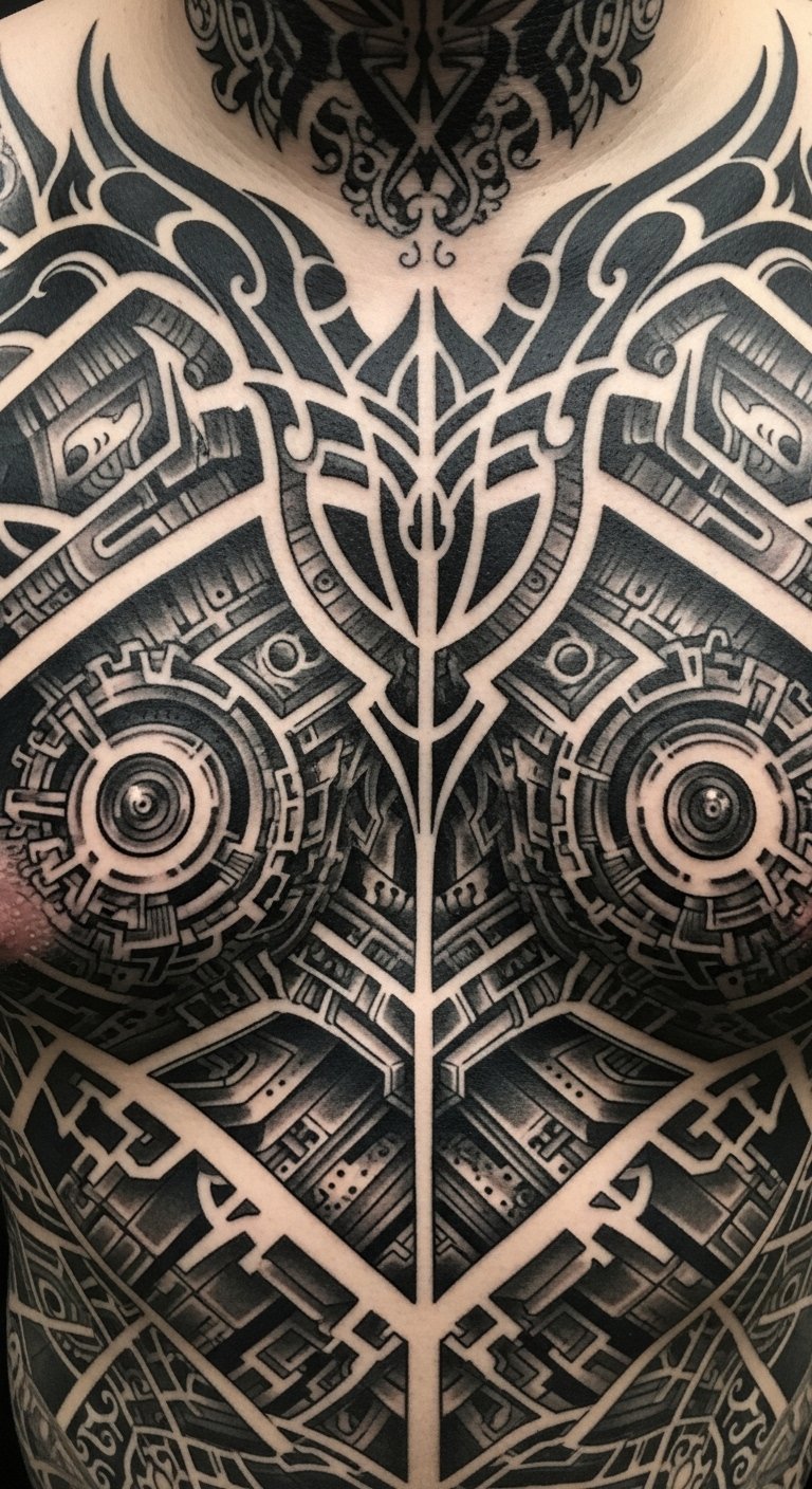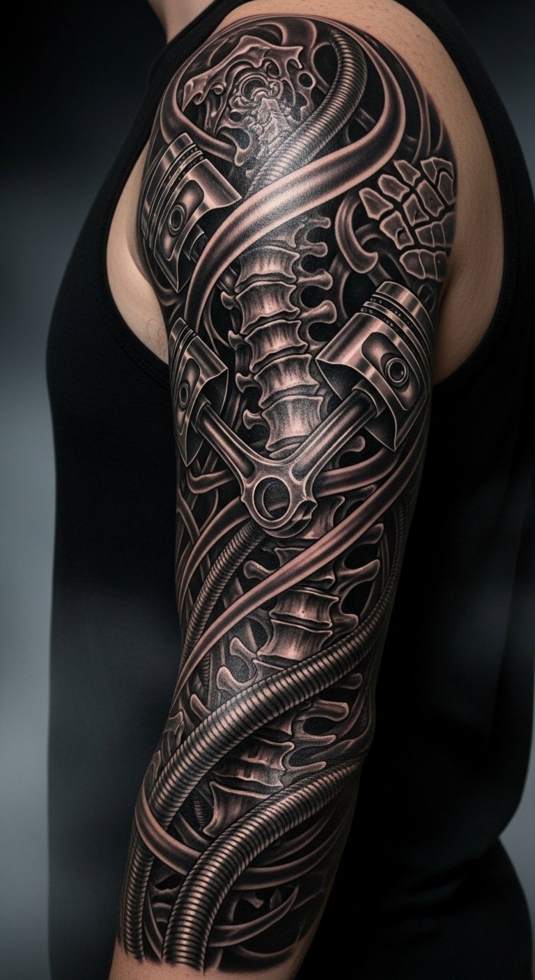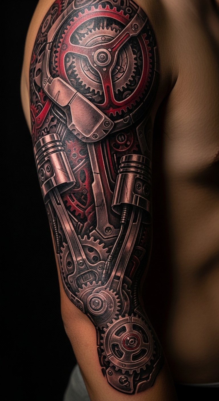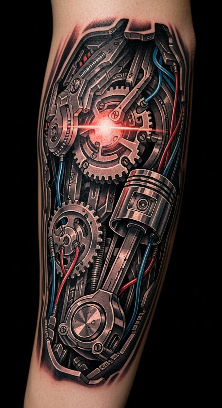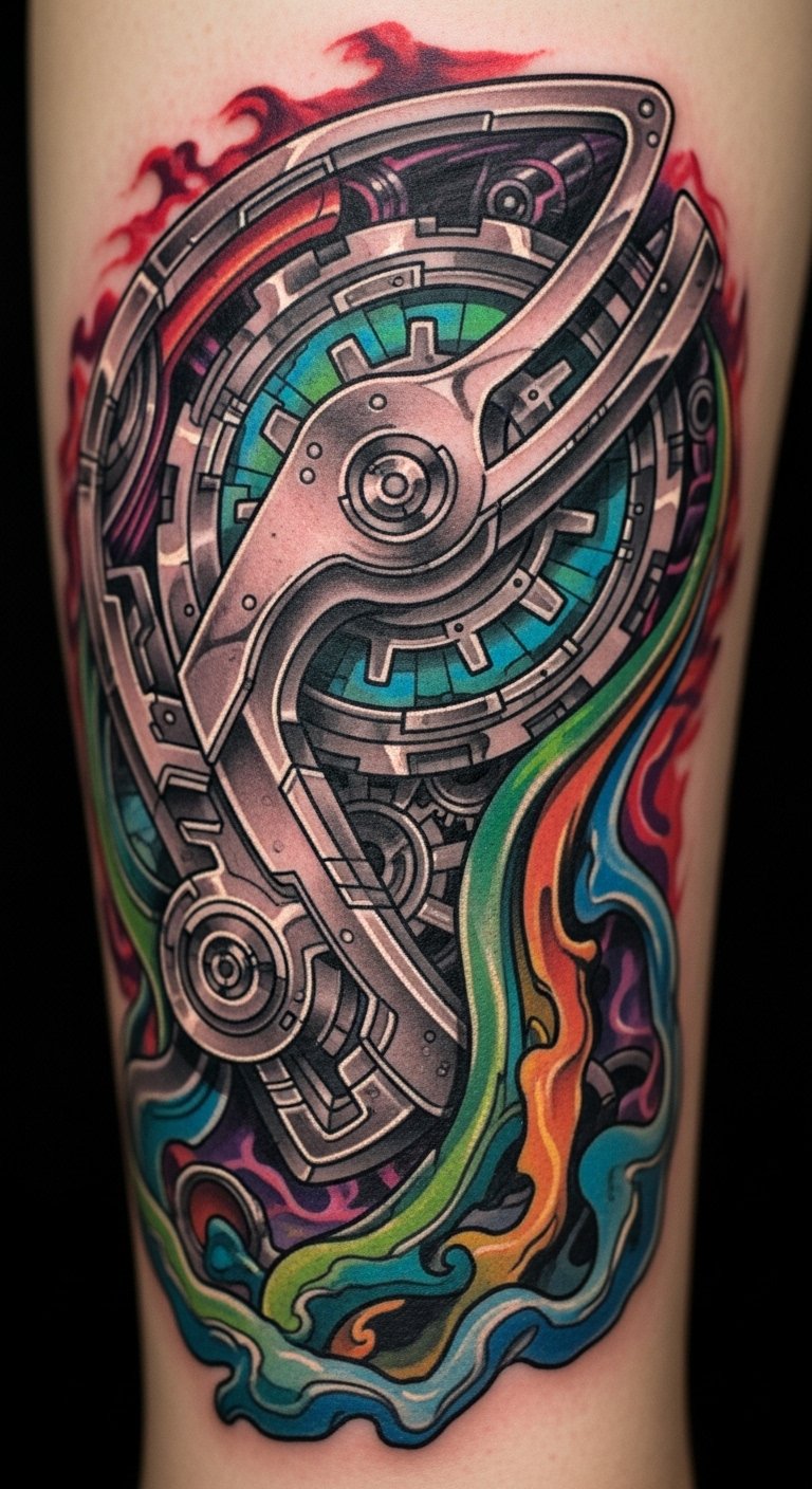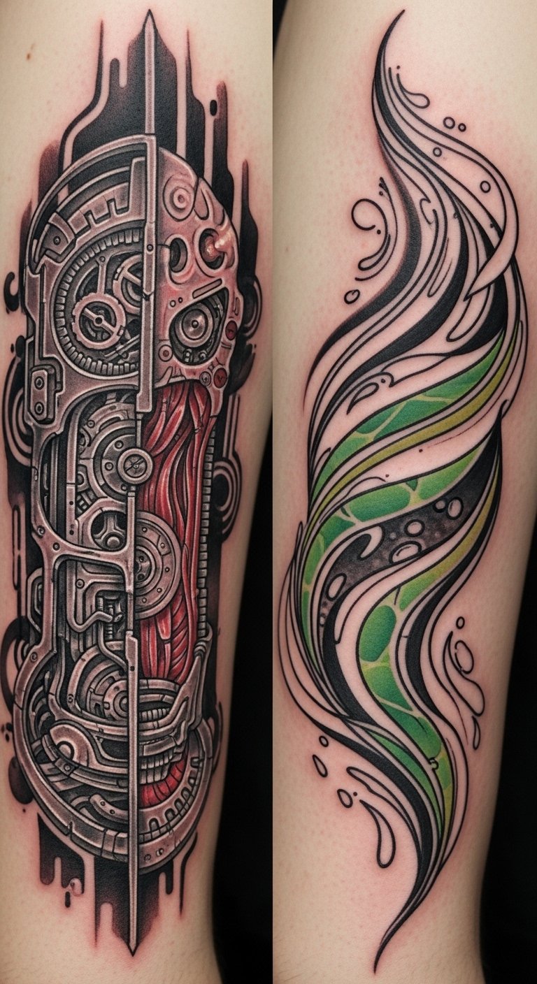 Merging organic and mechanical elements in biomechanical tattoos evokes a tension between flesh and machine: exposed sinew seamlessly transitioning into polished gears, vines entwining with pistons, and subtle circuitry flowing beneath skin-like shading.