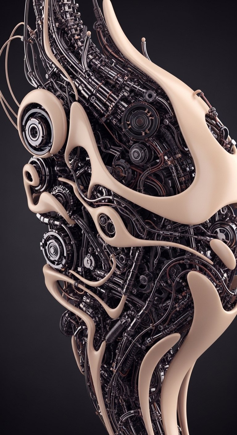 As a concept, this piece blends the tension between organic and synthetic to symbolize personal evolution and freedom: the flowing circuit veins represent inner pathways of thought and choice, the bioluminescent accents convey emotion and presence, and the tiny servomechanisms nod to resilience and adaptation.