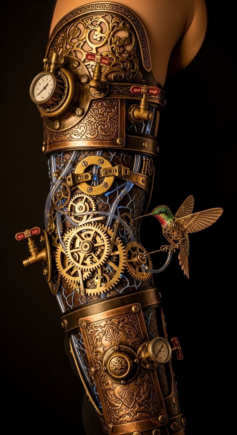 The design symbolizes the union of human spirit and engineered resilience—Victorian ornament represents heritage and grace, exposed gears and tendons speak to inner strength and motion, the hummingbird automaton adds whimsy and fragile hope; emotionally it evokes curiosity, nostalgia, and empowerment.
