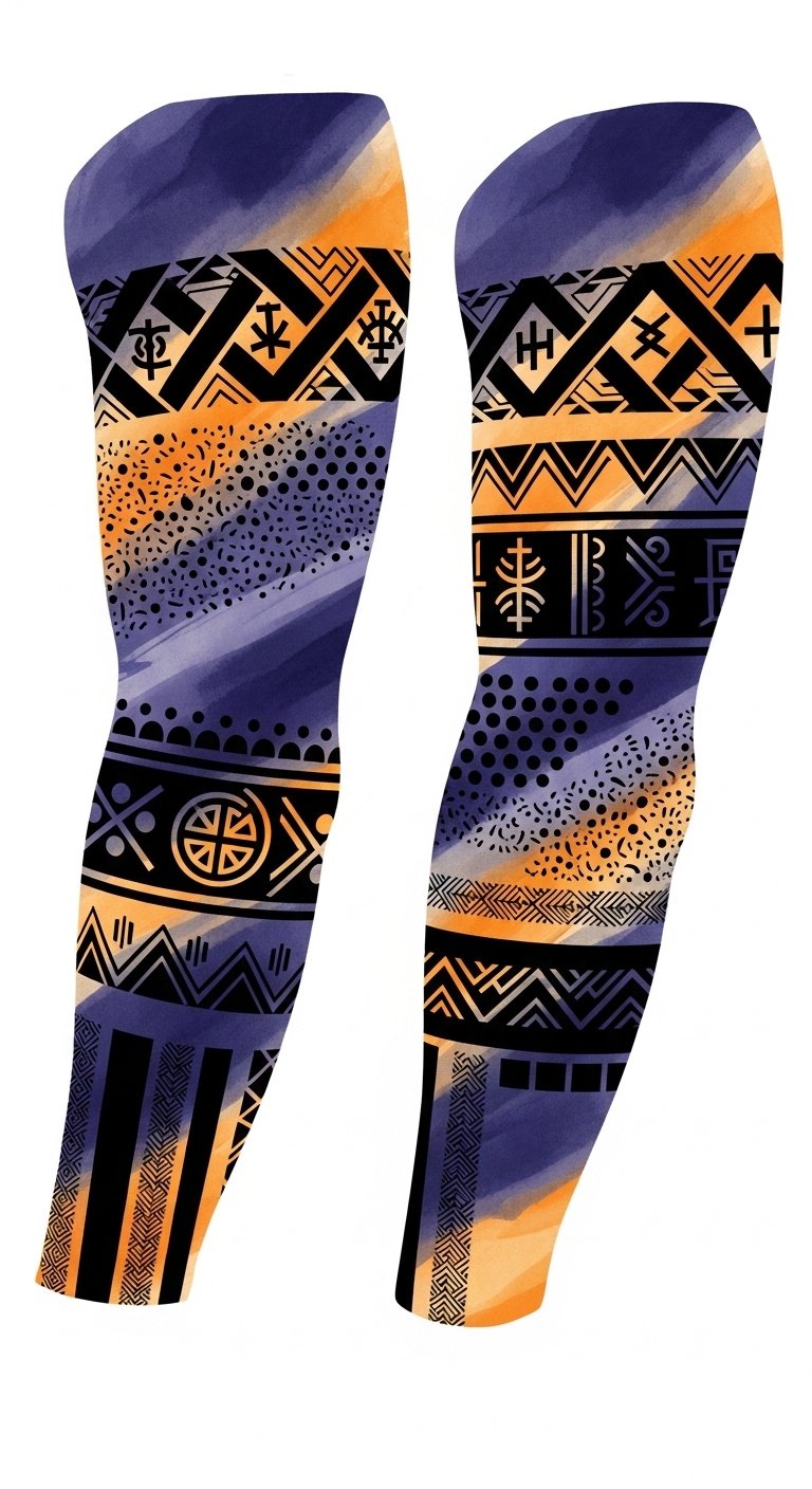 The symbolism combines ancestral strength (bold geometric bands) with personal evolution (fluid watercolor gradients), evoking resilience, continuity, and creative freedom; emotionally it feels grounded yet expressive, suitable for forearm or full arm placement where the wrap of the design mirrors life’s ongoing journey and allows visibility or concealment as desired.