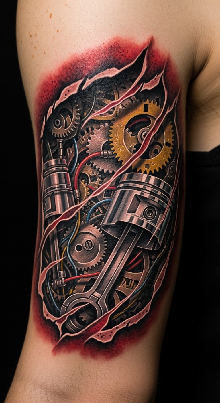 A forearm-to-shoulder tattoo where torn skin peels back to expose interlocking gears, pistons, and organic tubing rendered in metallic grays, copper highlights, and subtle blue luminescence; realistic torn edges with detailed epidermal shading and faint blood-gloss for contrast. Symbolically it represents the interplay between human vulnerability and inner resilience—the exposed mechanics as a metaphor for strength and the visible tear as openness or transformation. Emotionally it evokes awe and introspection, a balance of rawness and precision that suits prominent placements like the forearm, upper arm, or side rib to maximize movement and visibility.
