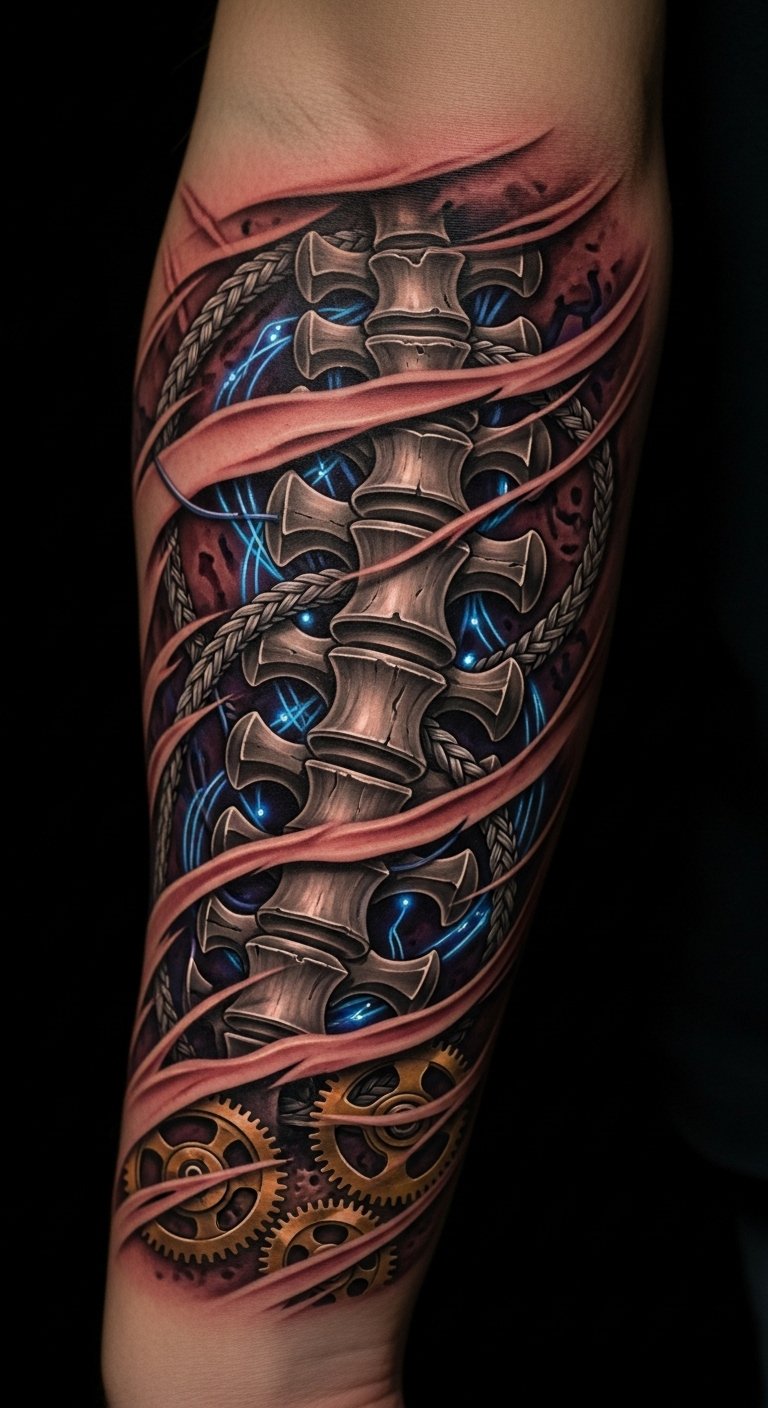The design symbolizes the fusion of humanity and technology—resilience, adaptation, and inner strength—evoking a contemplative, slightly unsettling emotion that speaks to transformation; ideal placement is a forearm wrap where movement animates the mechanical spine and glowing veins, with torn-skin edges aligned to natural muscle lines for realistic integration.