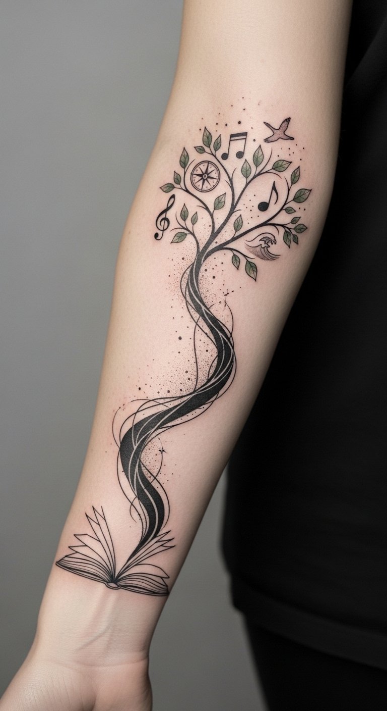 This design uses the open book as a foundation of personal history, the flowing ink-to-tree transition to symbolize growth and transformation, and the varied leaf-symbols to represent discrete facets of identity; emotionally it conveys continuity, resilience, and pride in individuality.