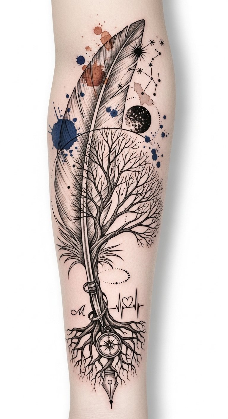 This design uses the quill-to-tree-to-constellation transformation to symbolize the evolution of a personal narrative—writing one’s story, growing through experience, and finding guidance in the stars—while the embedded compass, heartbeat line, and hidden initial serve as intimate markers of direction, life, and identity;