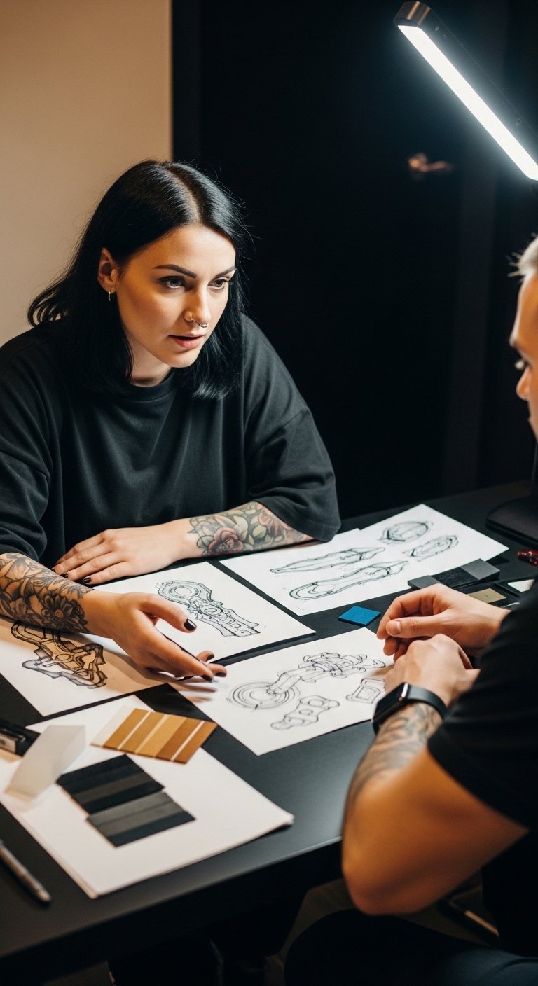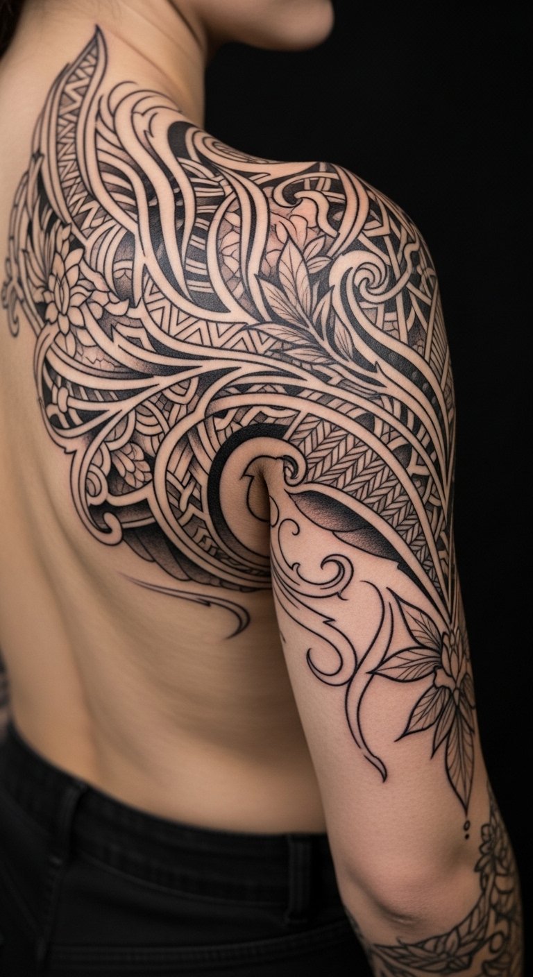 This design concept envisions a flowing, anatomically aligned tattoo that follows natural muscle lines and curves—wispy botanical vines that trace the collarbone and shoulder, a spiral of subtle geometric shapes that wraps around the forearm with the elbow’s fold, and a crescent of fine dotwork along the ribcage. Symbolically, the vines represent growth and personal evolution, the geometry stands for structure and intentionality, and the crescent evokes cycles and freedom. Emotionally the piece aims to feel intimate and empowering, integrating with movement so the art appears to breathe with the body; ideal placement is mapped to each wearer’s unique anatomy to enhance contours and create a seamless, personalized flow.