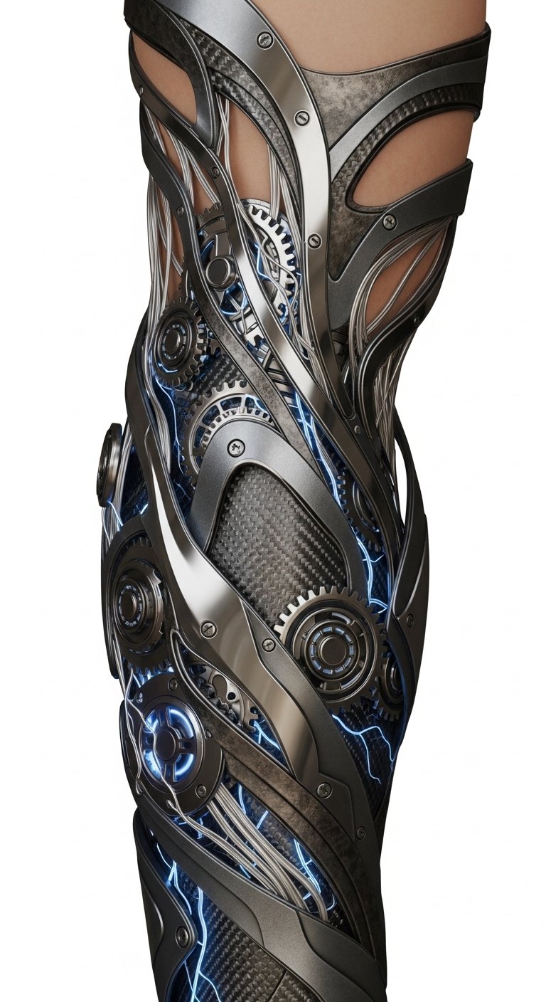 This forearm placement emphasizes motion and intimacy—every flex reveals shifting interplay between muscle and mechanism—evoking resilience, autonomy, and the emotional tension between vulnerability and control.