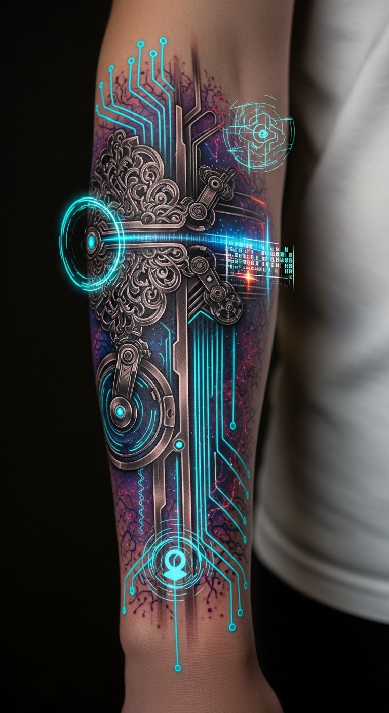 A sleeve tattoo that layers contrasting textures: neon circuitry and glowing glyphs weave through cracked concrete and rusted metal panels, punctuated by sleek robotic plates and transparent holographic overlays. Small vignettes of urban decay—burnt signage, broken glass—fade into crystalline data streams that pulse with color.