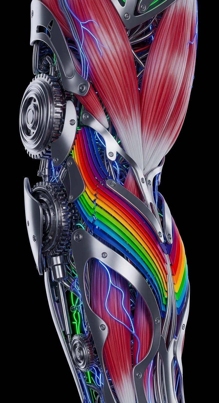The design symbolizes the fusion of human resilience and engineered precision—colored gradients suggest emotional depth while chrome components convey strength; glowing micro-circuit veins evoke inner energy.