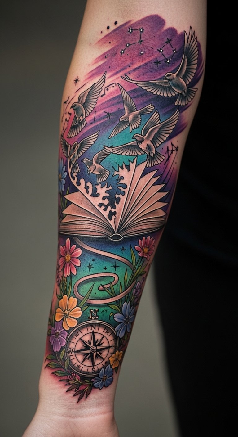 The open book turning into birds symbolizes personal growth and stories set free, the compass entwined with wildflowers represents guidance rooted in beauty and resilience, and the constellations suggest destiny and connection—together they evoke liberation, memory, and direction; best placed along the forearm where movement animates the narrative and allows both intimate viewing and public display.