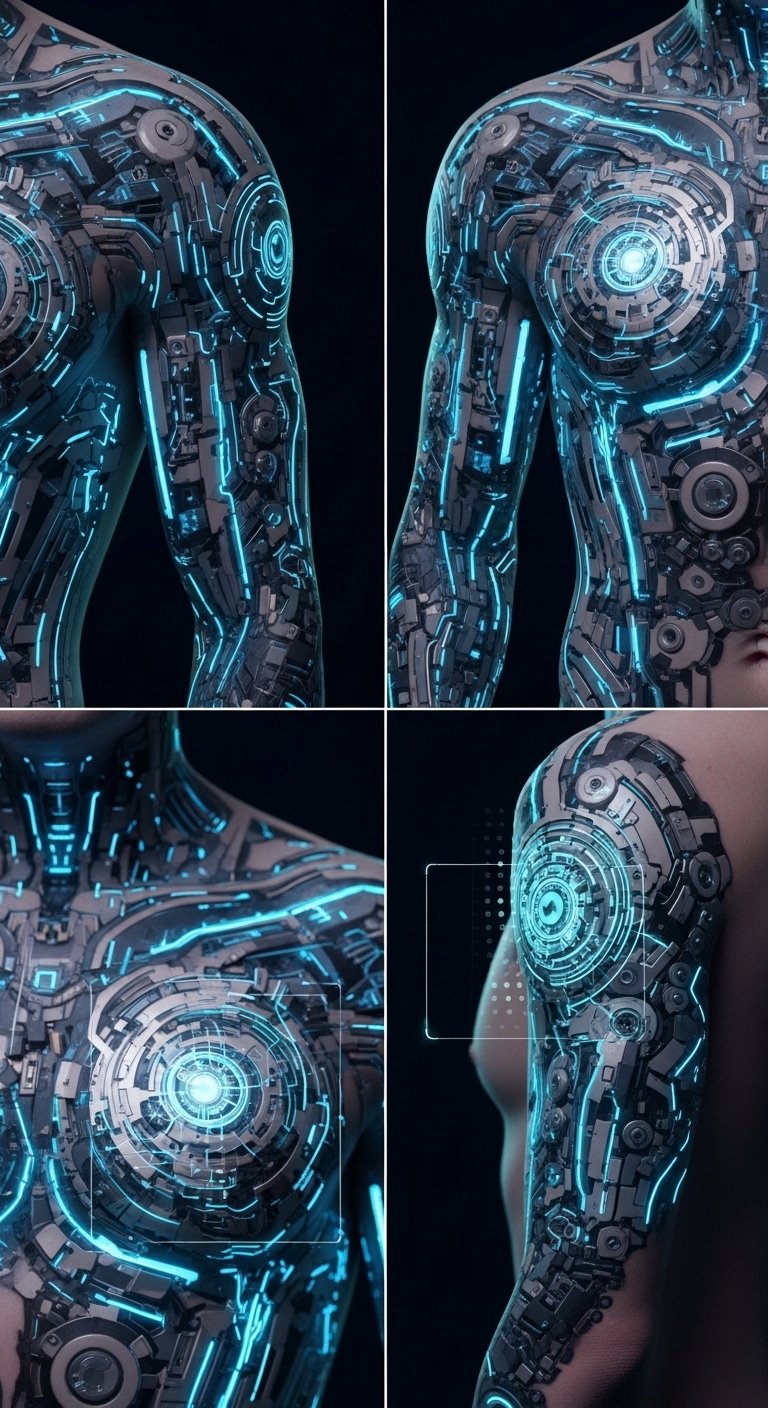 A forearm-to-shoulder sleeve design combining smooth metallic plates, subtle circuit filigree, and translucent organic mesh that appears to shift with muscle movement; AR markers woven into the pattern trigger animated overlays—pulsing light along seams, kinetic gears, and ephemeral wings—visible through an app. Symbolically it represents the union of human motion and technological evolution, expressing adaptability, personal identity, and creative liberty. Ideal placement is the dominant arm and upper chest so motion naturally animates the piece and public or private viewing can be controlled, enhancing intimacy and empowerment.