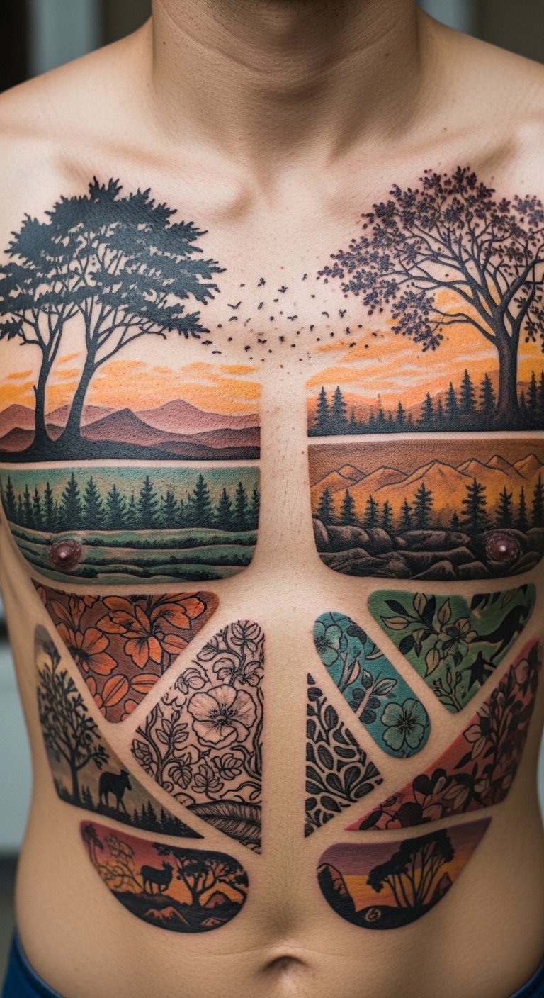 This design channels grounding and growth—tree silhouettes for roots and resilience, floral patterns for renewal, and wildlife motifs for instinct and freedom—meant to evoke a calm yet empowered emotional state; ideal placements are along the forearm or shoulder blade to follow natural contours, or as a vertical piece along the side/ribcage to suggest a living landscape that moves with the body, using earth-tone pigments and textured scarification to mirror seasonal shifts and tactile connection to the environment.