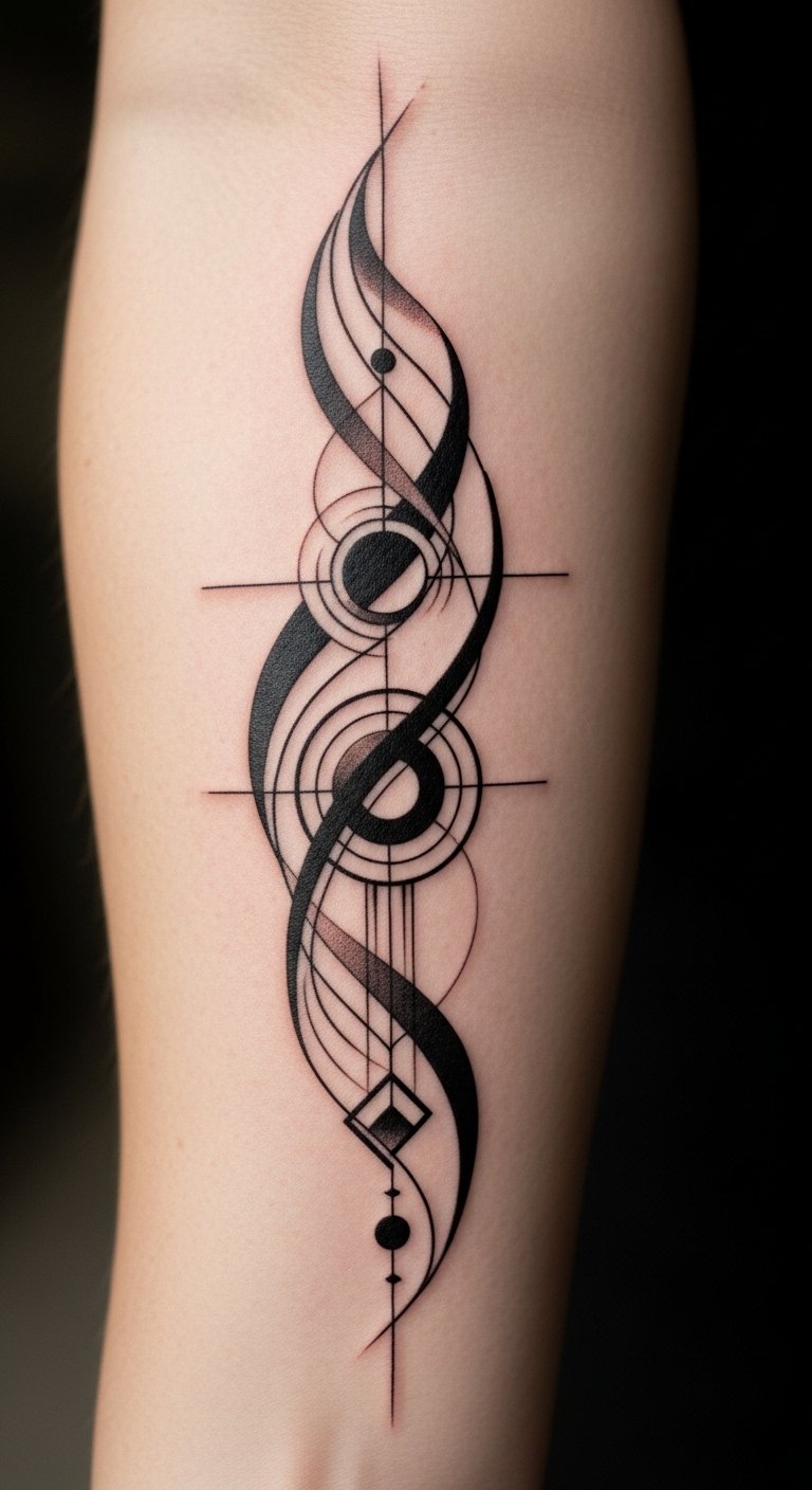 A flowing forearm tattoo combining delicate interwoven lines with discreet healing sigils and protective symbols—stylized knotwork, a small Hamsa, a spiral for renewal, and minimalist rune-like marks—rendered in fine black ink with subtle gold accents. Symbolism: the interwoven lines represent life’s connections while the healing and protection motifs signify resilience, ancestral guidance, and spiritual safeguarding; emotionally the piece feels grounding, comforting, and empowering. Placement on the inner forearm allows visibility for personal reflection and easy concealment, following the arm’s natural curves so each element reads both individually and as an integrated narrative.