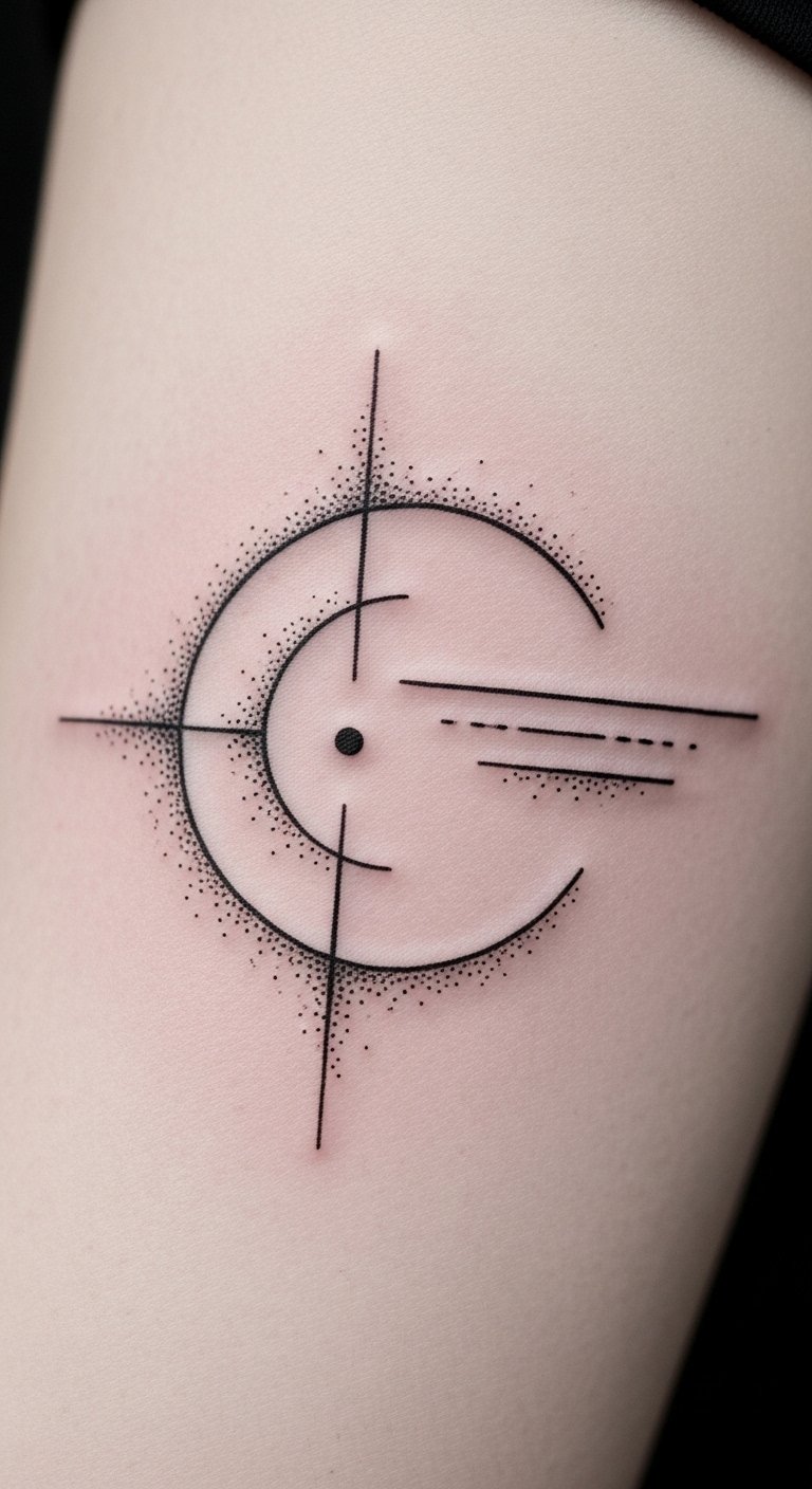 This design concept transforms cosmic elements into a scarification tattoo: finely spaced constellations trailing into a crescent of raised lunar phases, a central astrological glyph rendered with delicate planetary alignment above and a scattering of ethereal galactic dots and swirls.
