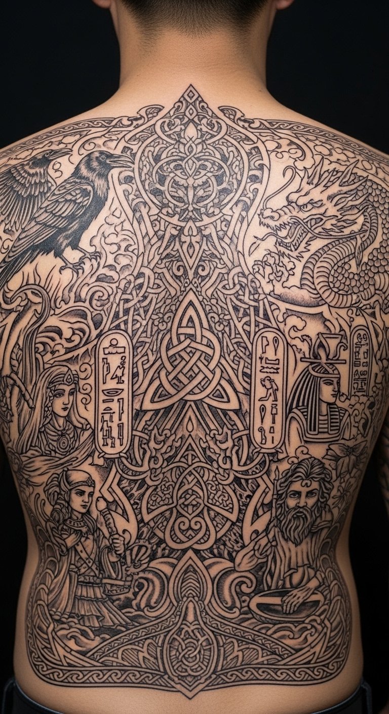A design concept centers a stylized mythological figure—such as a phoenix entwined with a horned deity or a warrior goddess—rendered in raised scarification lines and dotwork to evoke texture and depth; surrounding motifs include ancient script bands, symbolic animals, and elemental sigils. Symbolically this piece speaks to rebirth, courage, and the continuity of personal myth, aiming to provoke resilience and reverence. Emotionally it grounds the wearer in ancestral narrative while celebrating transformation; ideal placement is across the upper back or chest where the composition can span bone structure and flow with musculature, allowing both visibility and privacy as desired.