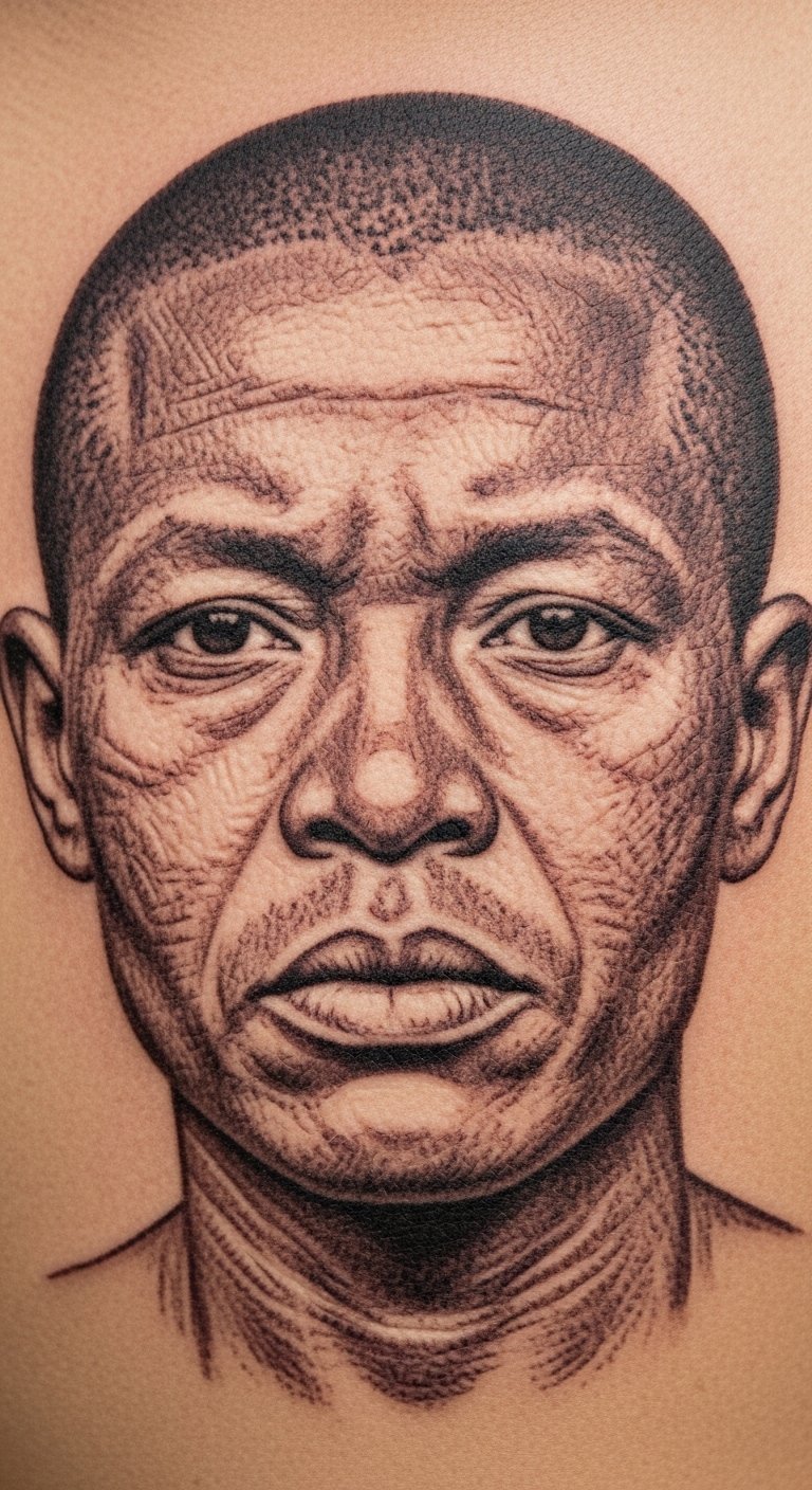 This design centers on a raised, textured portrait rendered in fine scarification lines that follow and accentuate the natural planes of the face, intended for the upper chest or shoulder blade where tactile detail can be felt and seen. Symbolically the piece honors memory and interpersonal bonds, blending cultural motifs around the portrait’s border to reference heritage and historical context; emotionally it evokes reverence and liberation, a visible testament to identity and personal narrative. Placement over the heart or shoulder allows interaction—touch reinforcing the “tactile experiences” theme—and integrates with surrounding body art as a focal point of connection.