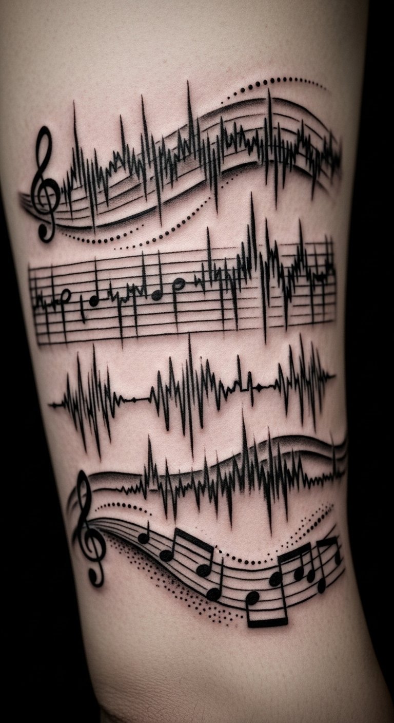 Explore sonic landscapes with melodic waves, creating acoustic designs that resonate deeply, celebrating your unique soundscapes exploration. The design symbolizes the wearer’s personal soundtrack—each waveform and beat marker representing moments, memories, or emotions—conveying movement, cadence, and resonance; placed along the forearm or ribcage it follows natural muscle lines for a dynamic effect, evoking intimacy when close to the heart or visibility and motion when displayed on the arm.
