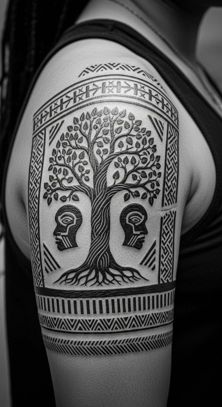The design symbolizes roots and continuity—the tree for lineage, faces for ancestors, and geometric marks for family emblems—evoking reverence, resilience, and belonging; ideal placement trails from shoulder to upper arm so it reads outward in ceremonial movement and can be shown or covered as chosen.