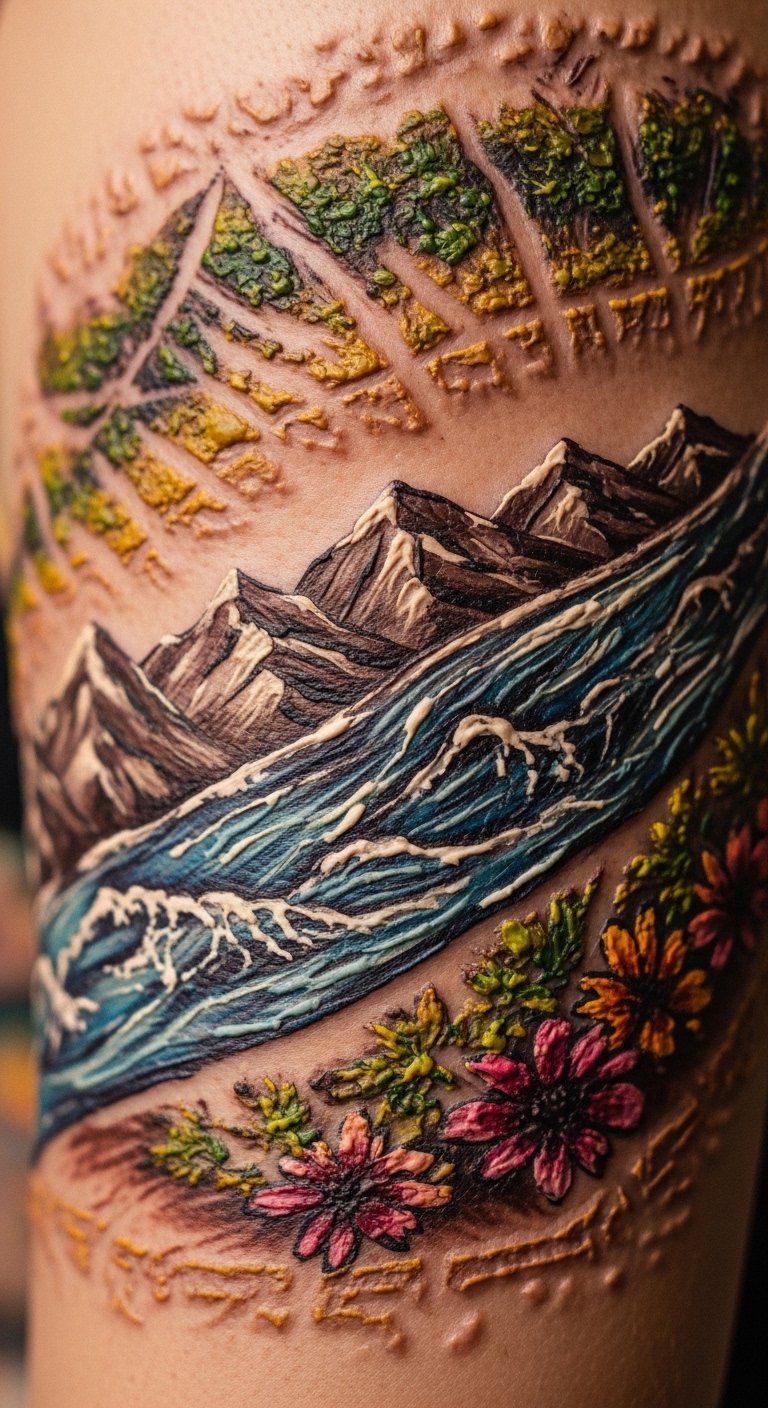 This design concept merges flowing water lines, jagged mountain silhouettes, and clustered botanical motifs into a cohesive sleeve or back piece, using negative space and textured scar-like shading to mimic natural surfaces.