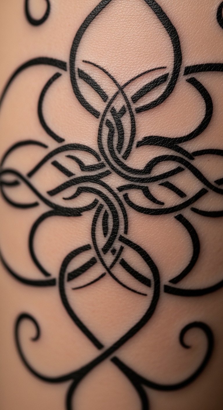 Soft negative space between crossings creates breathing room and highlights intersections where major changes or bonds occurred. Emotionally it conveys continuity, resilience, and the comfort of connection—suitable for a forearm or along the ribcage where the natural contours emphasize movement; a circular or spiral arrangement works well on the shoulder blade to suggest ongoing growth.