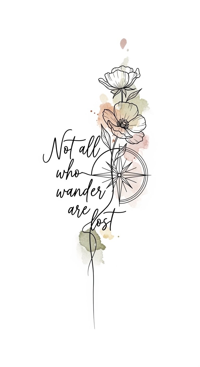 The script anchors the piece emotionally—words as a map—while the compass symbolizes direction and purpose, the wildflower embodies growth and resilience; together they evoke calm determination and gentle empowerment.