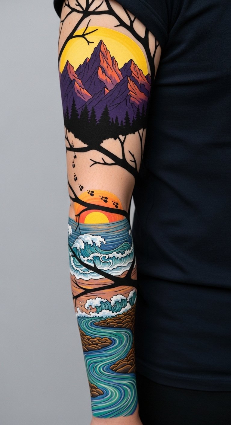 A flowing forearm or calf piece that weaves intertwining tree branches with delicate floral motifs, a layered mountain range outlined by a warm sunset silhouette, and subtle animal tracks, wave lines, and river-like curves connecting each element; use fine-line black ink with selective muted greens, blues, and ochres for color accents.