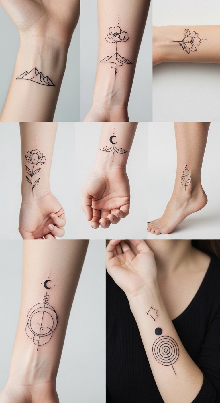 A slender continuous-line design that weaves a small wildflower, a crescent moon, and a single abstract wave into one flowing motif; fine black ink, delicate negative space, slight tapering at line ends for softness. Symbolically this compact piece blends growth (wildflower), intuition and cycles (crescent moon), and adaptability (wave), evoking quiet confidence and personal evolution. Emotionally subtle and intimate, it suits inner-forearm, behind-ear, collarbone, or ankle placement for a discreet yet meaningful daily reminder.