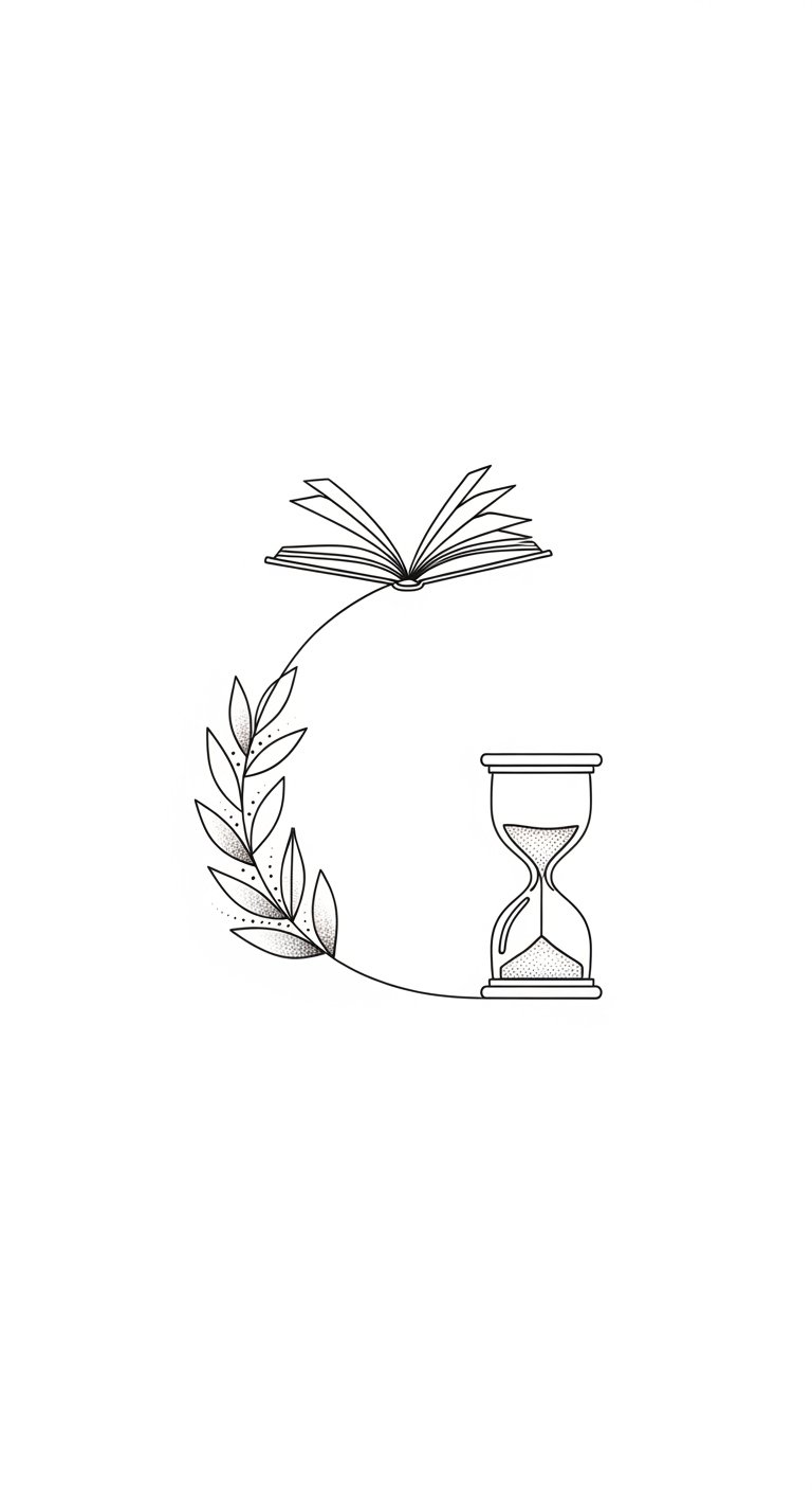 The book represents knowledge and lived experience, the laurel branch symbolizes achievement and resilience, and the hourglass evokes the passage of time—together creating a compact narrative about growth and legacy; place along the inner forearm for visibility and daily reflection, or over the upper chest near the heart for intimate, personal resonance.
