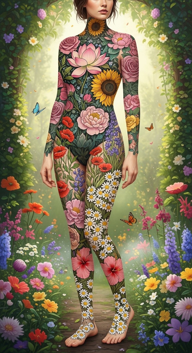 This tattoo concept uses the listed floral elements to symbolize personal growth, resilience, and the cycles of life—roses for love and strength, lotus for spiritual rebirth, daisies for innocence, hibiscus for delicate beauty, sunflowers for optimism, wildflowers for freedom, peonies for prosperity, and vintage flowers for memory and legacy. Arrange the motifs in a flowing, interconnected composition that moves with the body: a shoulder-to-sleeve cascade for expansive storytelling, a ribcage panel for intimate meaning, or an ankle-to-calf vine for steady progression. Balance linework and soft shading to evoke both botanical detail and emotional warmth.