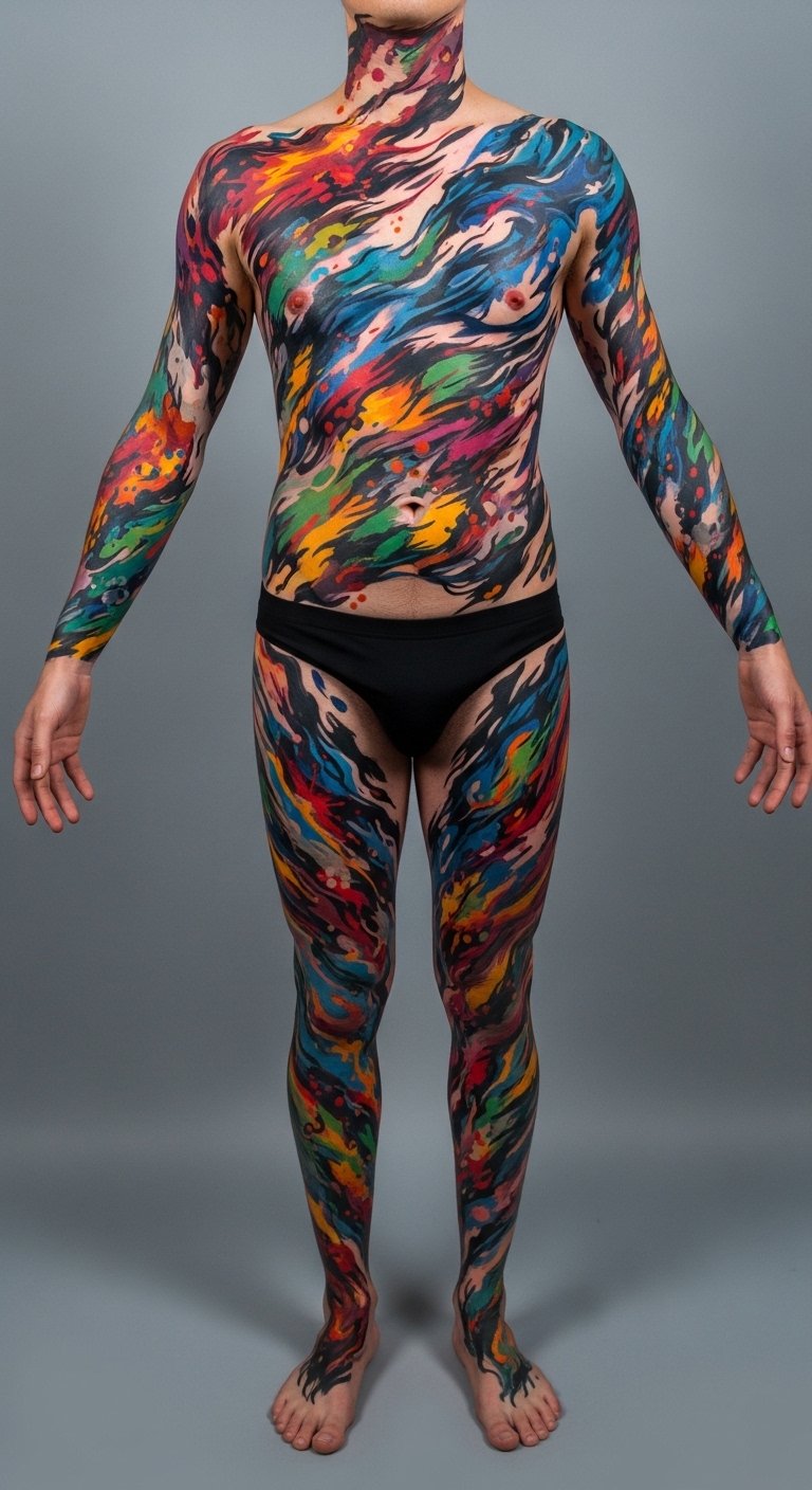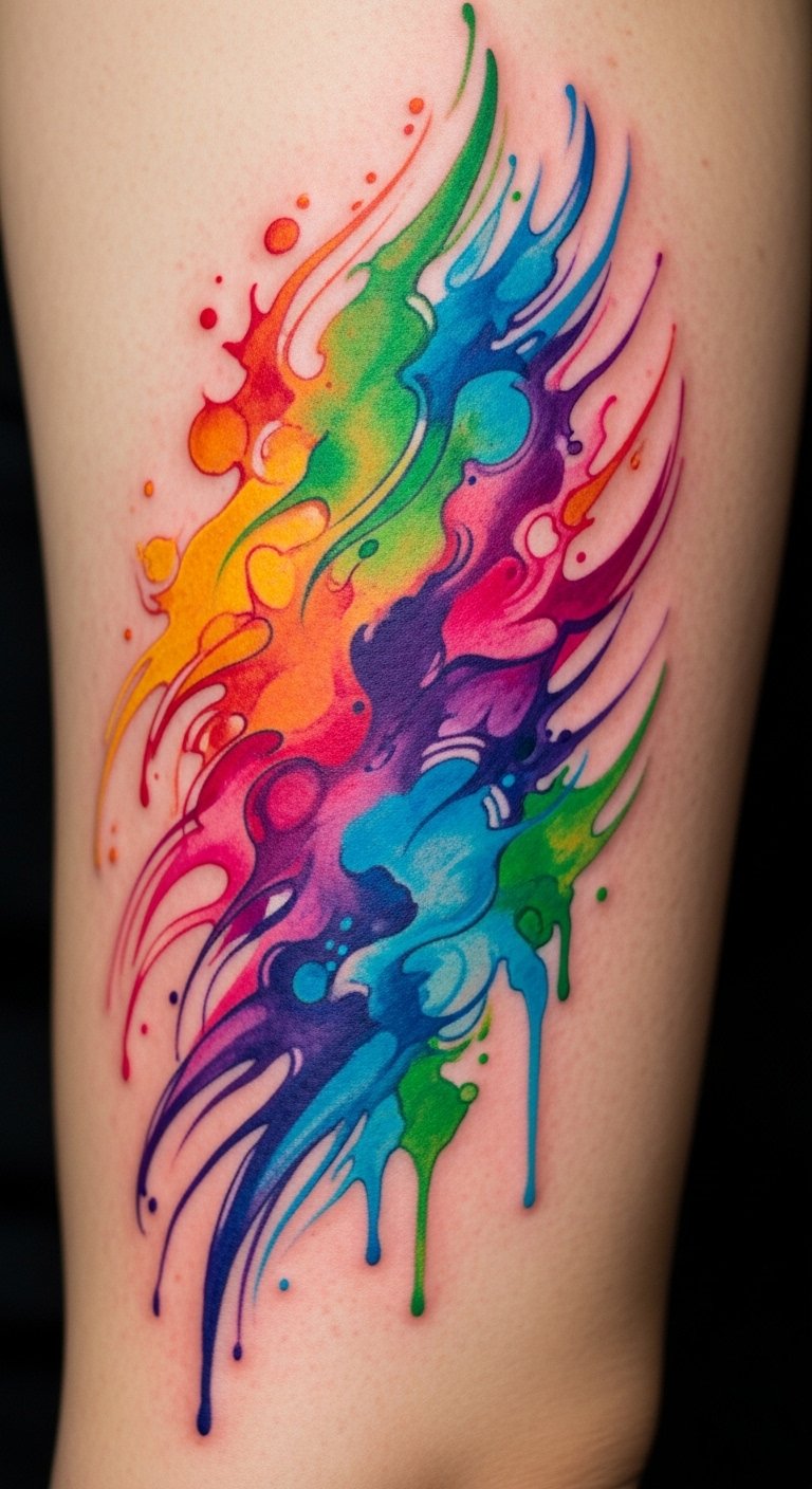 The symbolism speaks to transformation and emotional fluidity—colors chosen for personal associations (calm, passion, renewal) layered to suggest depth rather than defined shapes—evoking a sense of release and organic growth; ideal placement follows musculature for movement with gestures that peek around clothing, letting the piece feel intimate yet expressive.
