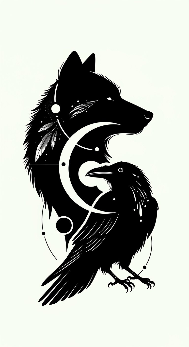Let your creativity soar! The design blends wolf and raven symbolism—loyalty, intelligence, and transformation—evoking protection and introspection; its stark contrast and clean lines create a calm, powerful emotional tone ideal for visible placements like the forearm or upper back where the silhouette can read clearly and interact with body contours, while the small geometric accents offer balance and a subtle modern touch.