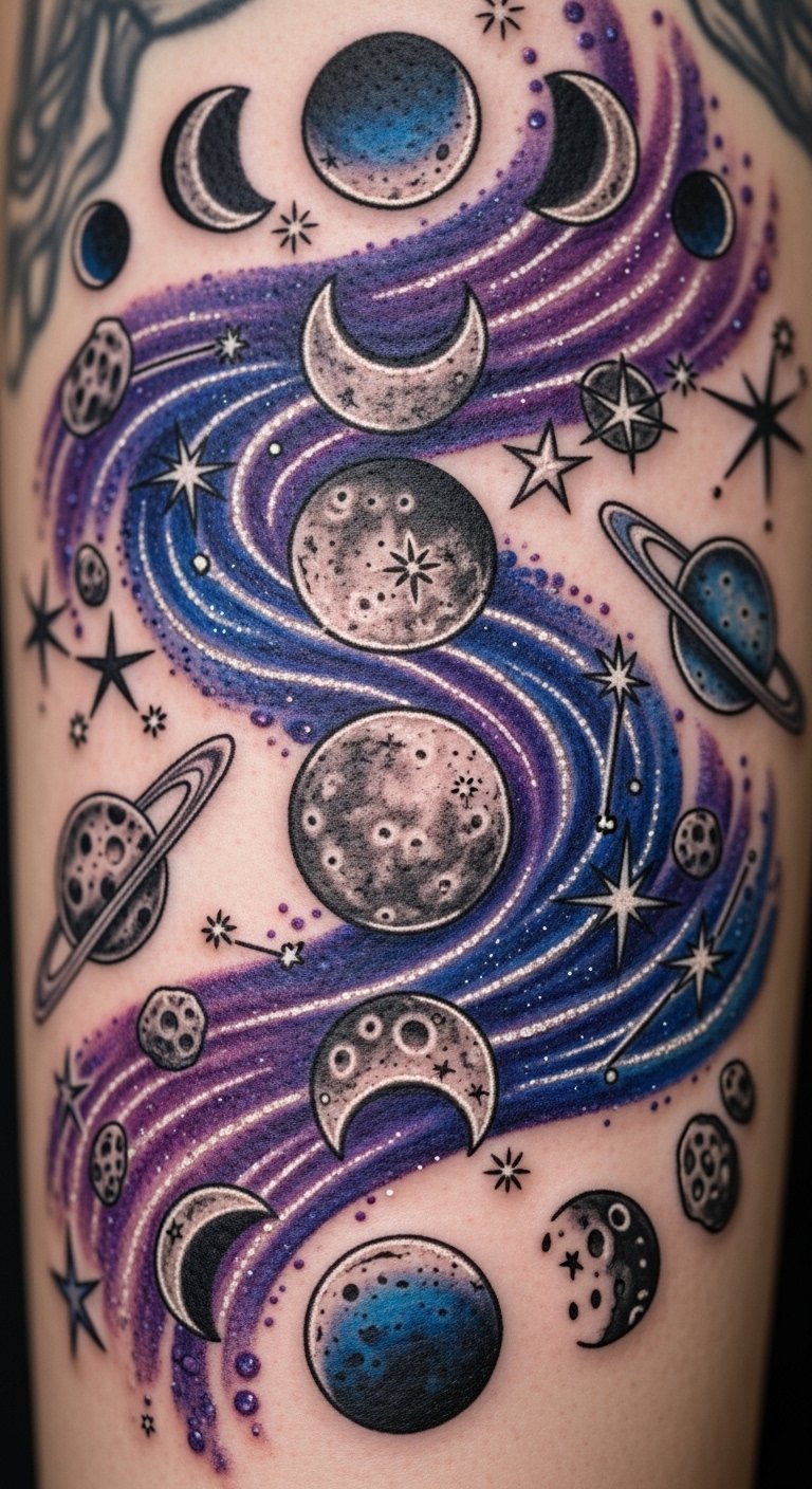 This design concept weaves constellations, moon phases, planetary sigils, and drifting asteroid motifs into a flowing composition that can span shoulder to forearm or curve along the ribcage; the symbolism speaks to guidance (constellations), personal cycles and growth (moon phases), identity and influence (astrological and planetary symbols), and resilience or change (asteroids and stardust trails).