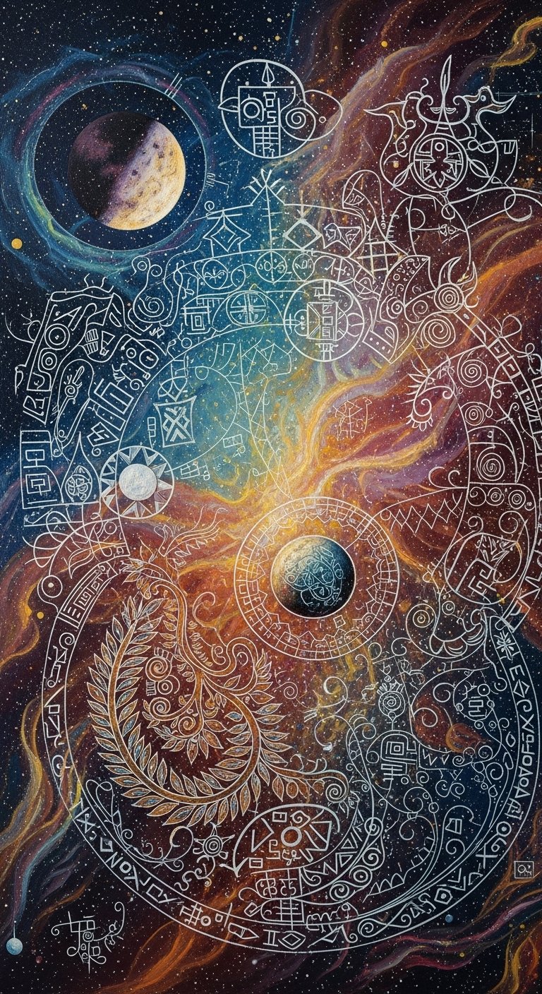 A flowing sleeve tattoo that integrates celestial elements (crescent moon, subtle star field) with bold ancestral motifs and repeating ethnic patterns; use high-contrast black linework with selective color accents (deep indigo, ochre, crimson) in key motifs; interlace ritualistic symbols and stylized folk-art flora along the forearm, transitioning from cosmic imagery at the shoulder to rooted folk patterns near the wrist. Symbolically this design bridges the personal and the cosmic—ancestral symbols anchor identity and history, ritual designs convey spiritual continuity, and the cosmos evokes wonder and connection; emotionally it should feel reverent, proud, and grounding. Ideal placement: full arm sleeve or upper arm wrap to allow narrative flow and gradual transition of elements.