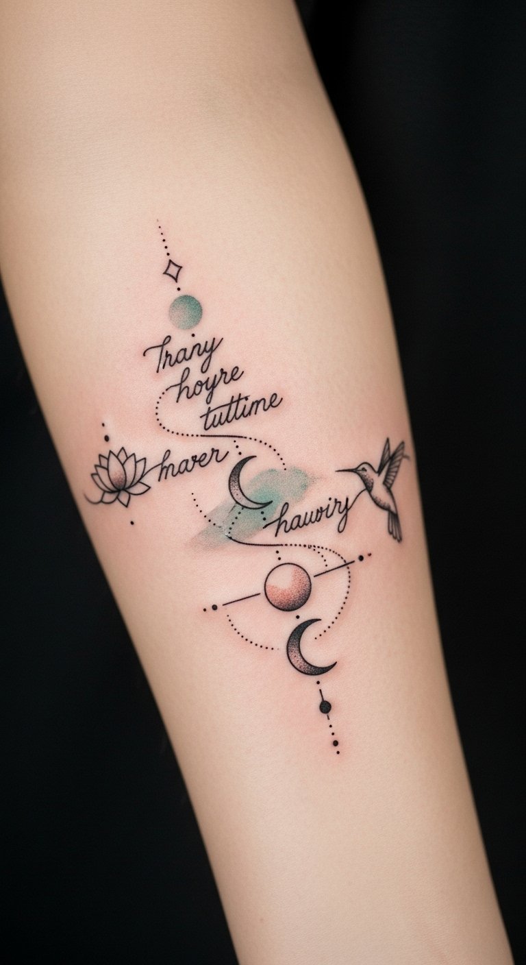 The design weaves the original text into a flowing line, the script transforming into tiny symbolic motifs that represent growth (lotus), cycles (moon and sun), and lightness or resilience (hummingbird). Fine line and dotwork create an intimate, contemplative feel; a muted wash adds softness without overpowering the words.
