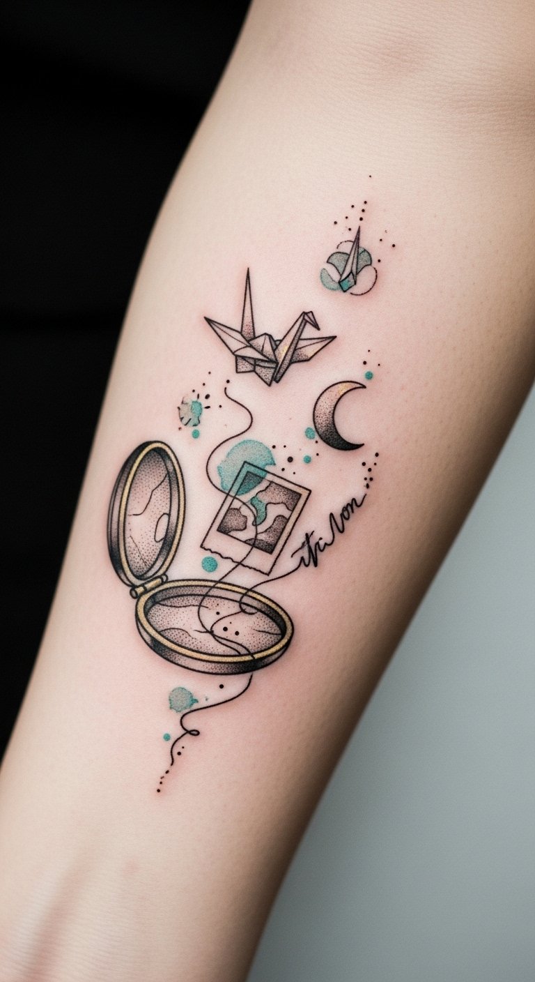 Sepia tones evoke nostalgia while the muted watercolor hints add a dreamlike quality. Ideal placement is the inner forearm for visibility and intimacy, allowing the wearer to read and reflect on the imagery during quiet moments.